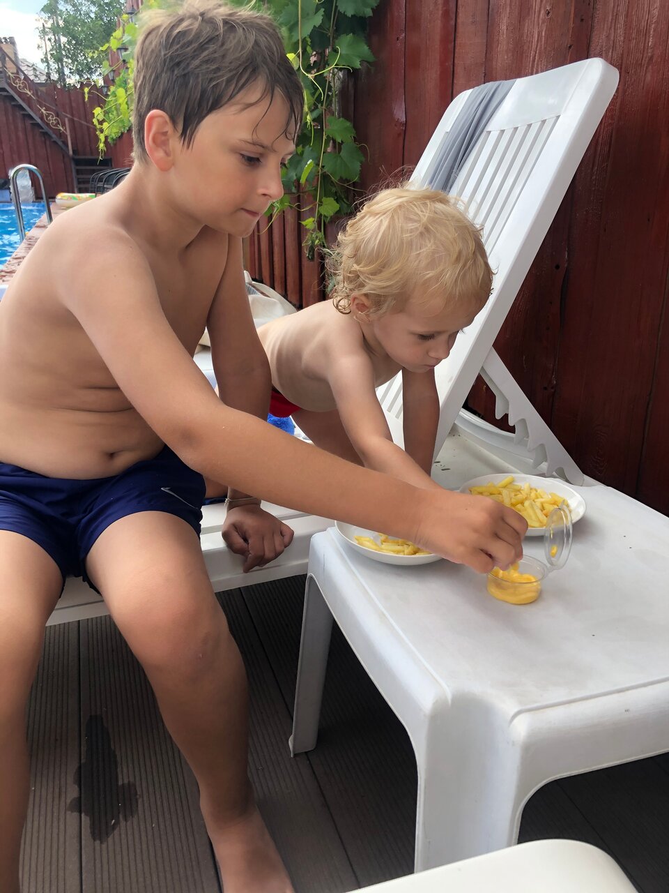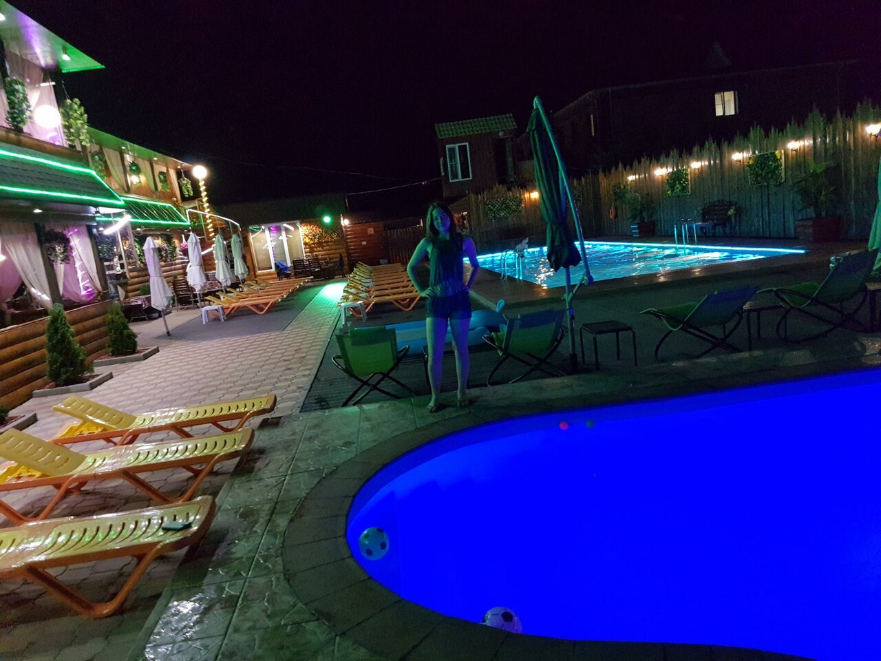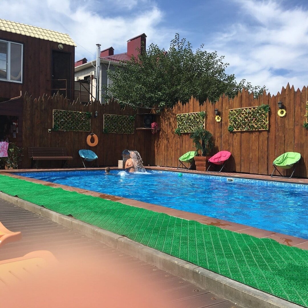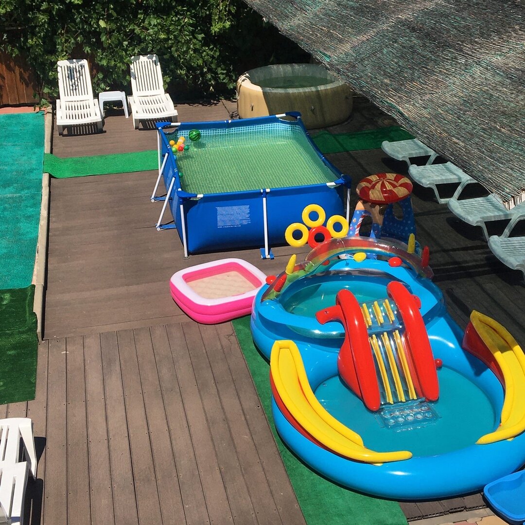 Небольшой аквапарк, 2 бассейна, горки. Для малышей небольшой каркасный бассейн. Пиковое время с 16-17 часов. Свободный шезлонг надо поискать. Бассейны на две глубины — малышам и взрослым.