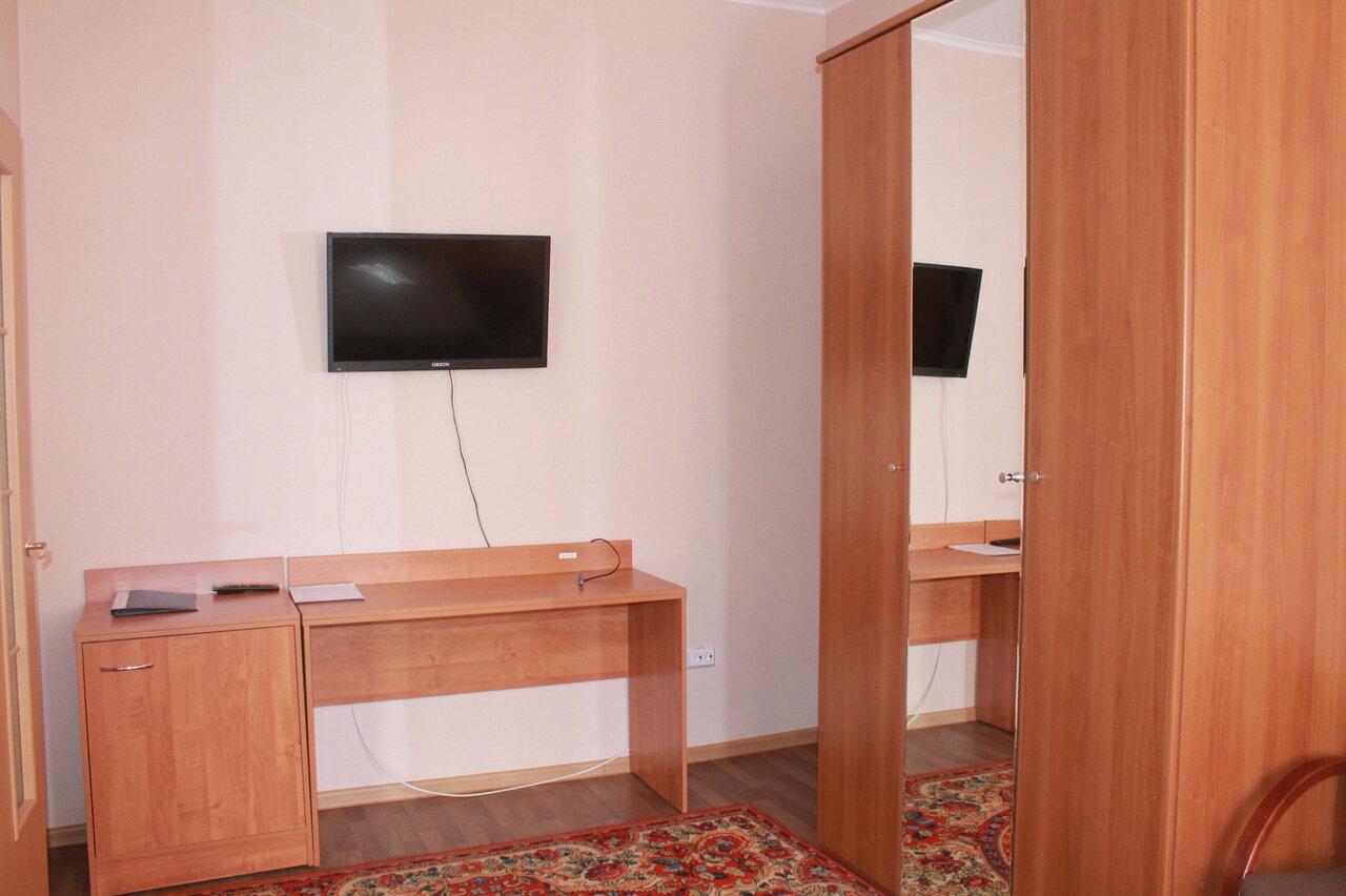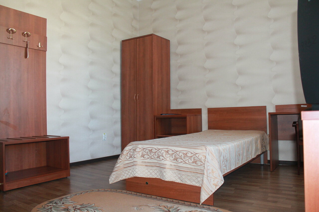 Отличный сервис, приветливый персонал. Всё понравилось. Уборка номеров ежедневно (кроме выходных), частая замена постельного белья и полотенец (4-х: большое банное, лицевое, ножное мохровые, и кухонная салфетка). На каждом этаже есть кухня: микроволновая печь и электрическая плита на 4 комфорки с духовым шкафом. В номере (конкретно одноместный стандарт); - вешалка с обувницей; - большой шкаф для одежды; - навесной шкаф с посудой (тарелки, вилки, лодки, нож, кружки, графин); - стол; - шкаф с посудой (три кастрюли и сковорода); - холодильник; - чайник; - телевизор; - кондиционер; - санузел совместный (кстати ванна, не душевая кабина). В номерах тепло. Есть столовая, но оценить не могу, т.к. готовил сам. Общий вывод, отличная гостиница по доступному бюджету.