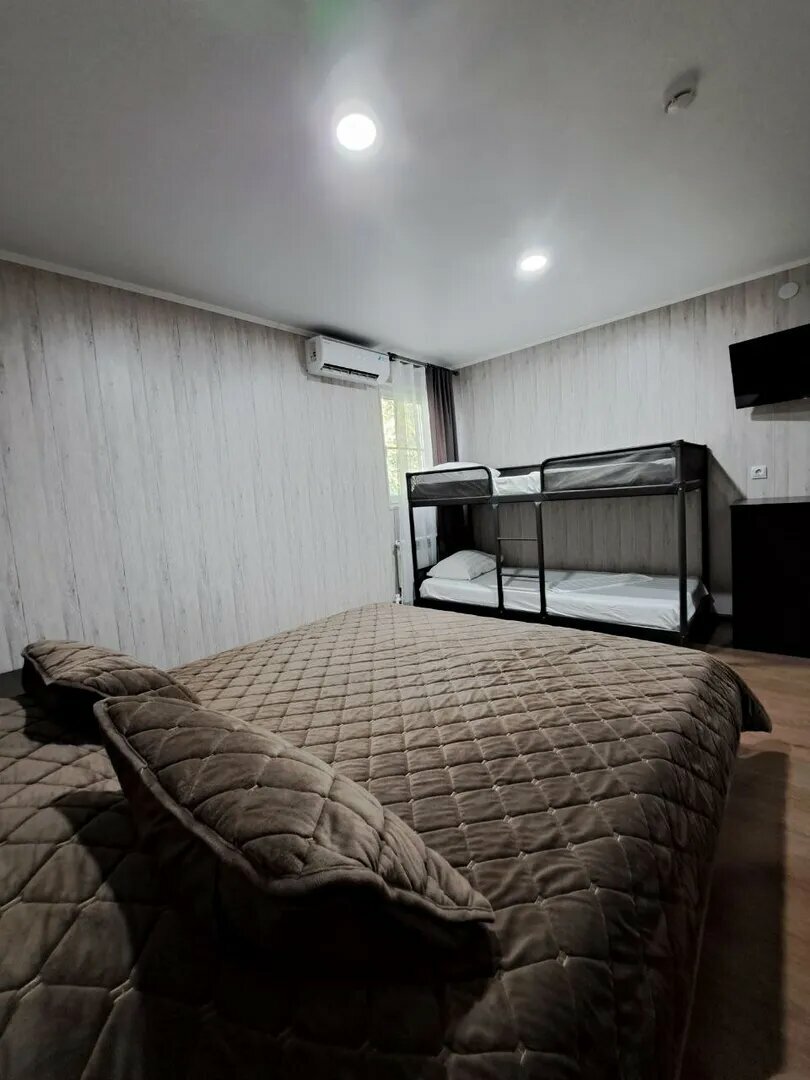 Однокомнатный номер, общей площадью 17 кв.м. В номере кондиционер, холодильник, телевизор, электрочайник, микроволновая печь + набор посуды.Спальные места – 2 кровати и диванчик, или 2х-спальная кровать и диванчик.3-основных места.