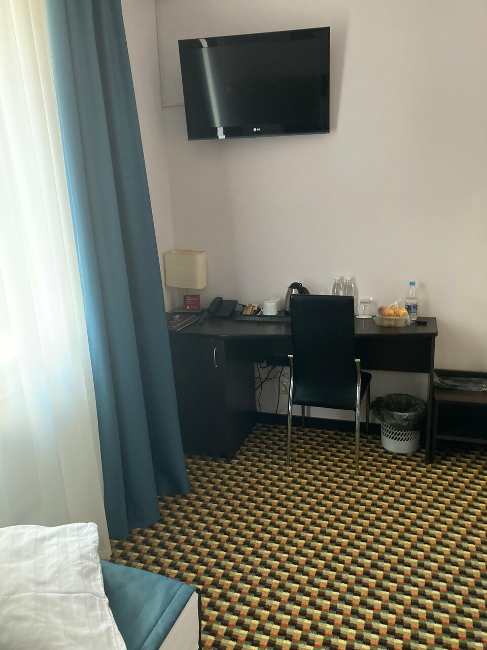 Шикарный, незамызганный отель! Забронировал номер за месяц просто по телефону. Все чисто, аккуратно. Номер ‘стандарт’ нормальный, Санузел просторный. Постоянно клали чай и кофе. Телевизор для таких номеров огромный!) Парковка очень удобная! Персонал приветлив и вежлив. Большое спасибо! У