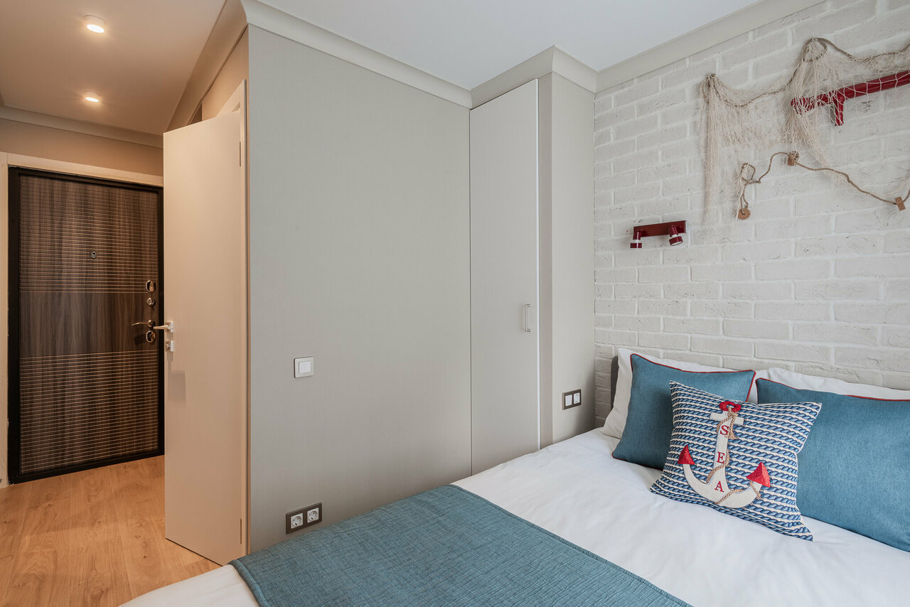 Уютная светлая студия 29-34 м² для проживания 1-4 человек. Интерьеры апартаментов выполнены в спокойных пастельных тонах.