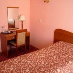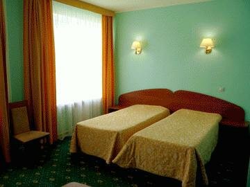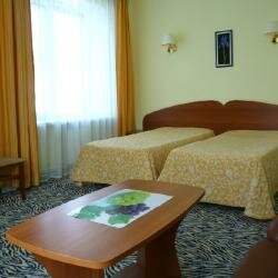 Вполне приличная гостиница. В номере чисто. У меня был номер ‘стандарт’. Обстановка соответственно стандартная: кровать, стол, тумба, стул. Есть телевизор. Санузел совмещенный. У меня номер был с ванной. Мыло, гель для душа, шампунь (одноразовые) есть. В номере комфорт был фен. В коридоре кулер. Есть кафе. С 7.30 утра до, если не ошибаюсь, 19-00 можно зайти покушать. Меню не ресторанное, но кормят вкусно, кофе хороший.