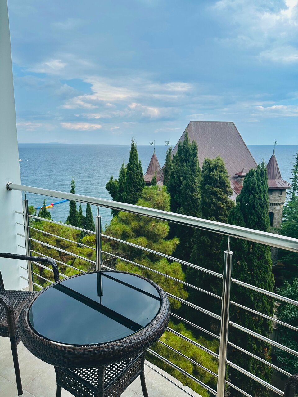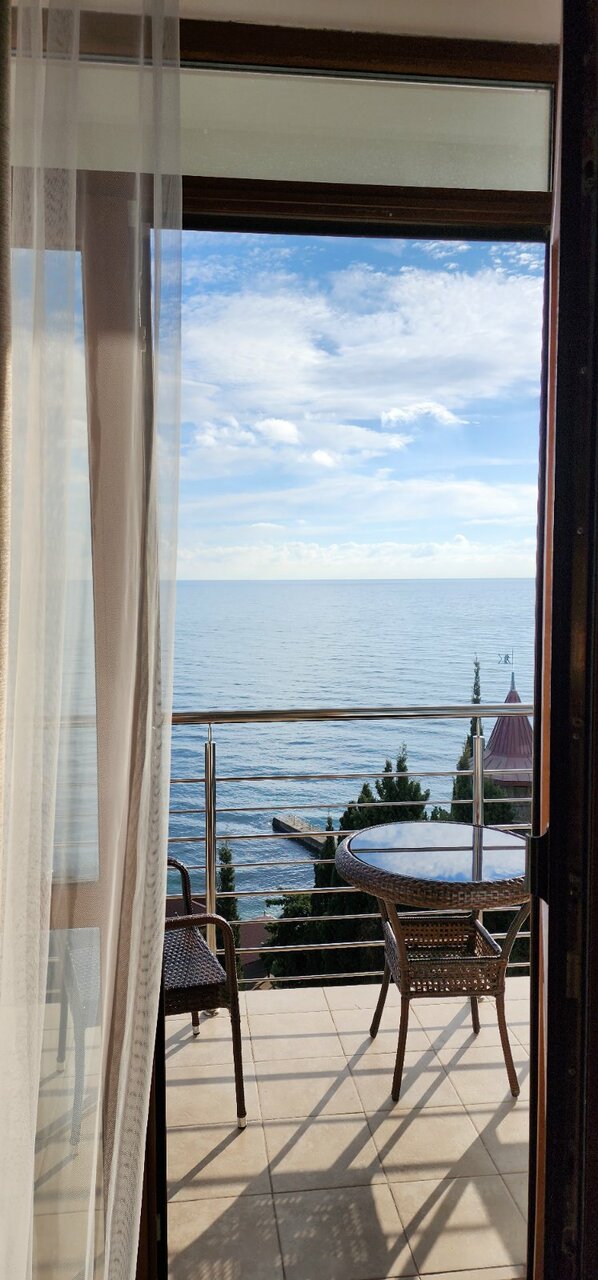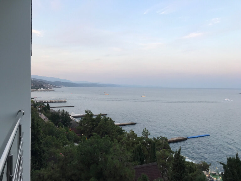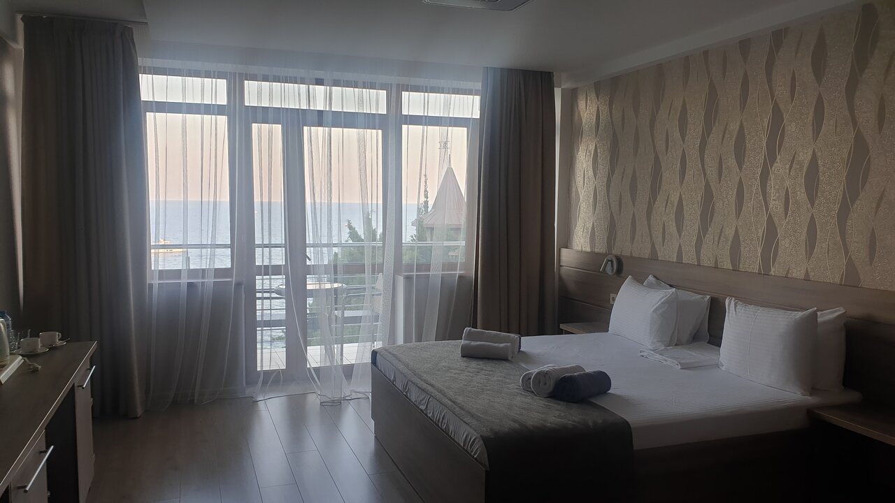 Хороший отель, номера новые и чистые, есть все необходимое — шампуни, тапочки, холодильник и т.д. Из номера открывается прекрасный вид на море, идти до него минут 5-7. Рядом как раз платный пляж с лежаками, оказалось на этой набережной он лучший) в день приезда отключали свет и воду, но такая ситуация была во всем городе, нужно быть готовым к этому в Крыму, персонал сгладил ситуацию, девушки были очень приветливыми. Отель полностью соответствует цене, советуем 🙂