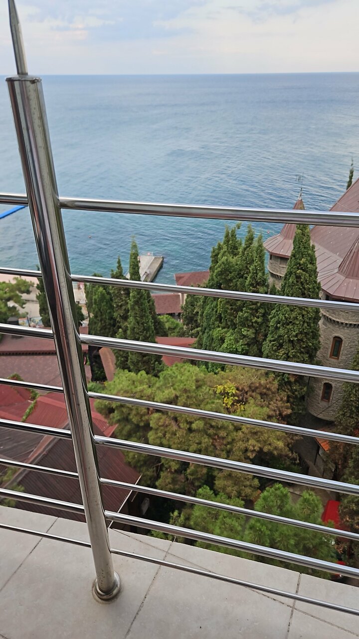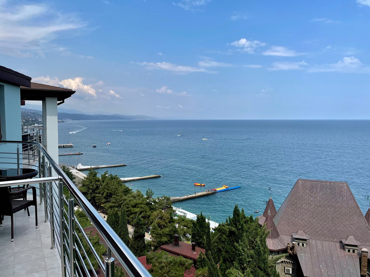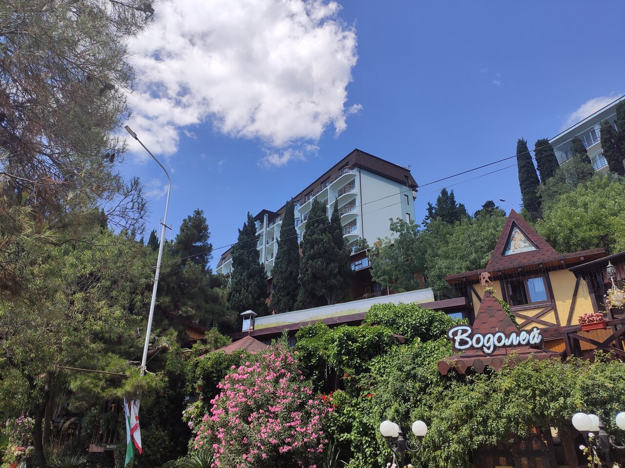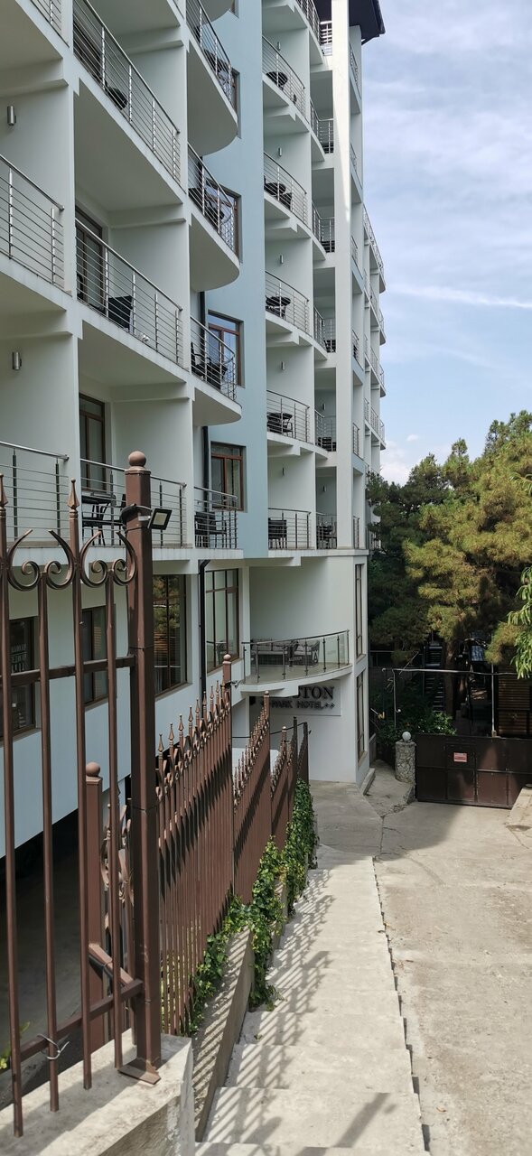 Хороший отель, номера новые и чистые, есть все необходимое — шампуни, тапочки, холодильник и т.д. Из номера открывается прекрасный вид на море, идти до него минут 5-7. Рядом как раз платный пляж с лежаками, оказалось на этой набережной он лучший) в день приезда отключали свет и воду, но такая ситуация была во всем городе, нужно быть готовым к этому в Крыму, персонал сгладил ситуацию, девушки были очень приветливыми. Отель полностью соответствует цене, советуем 🙂