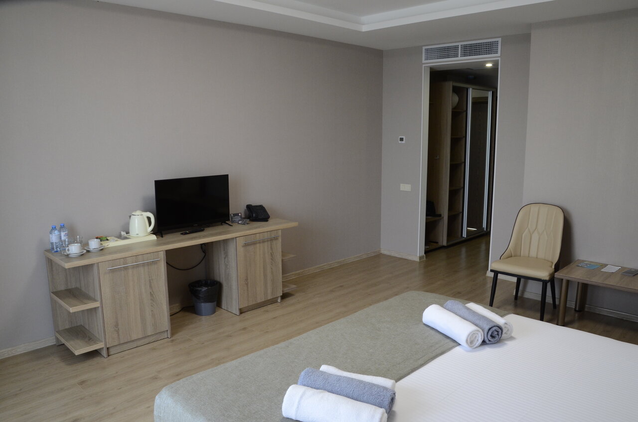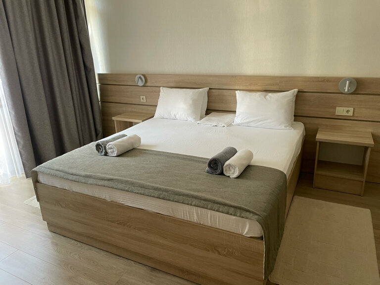 Просторный двухкомнатный номер с огромным балконом, с которого открывается потрясающий вид на море. Завтрак 'шведский стол' включён в стоимость. Собственная охраняемая парковка.