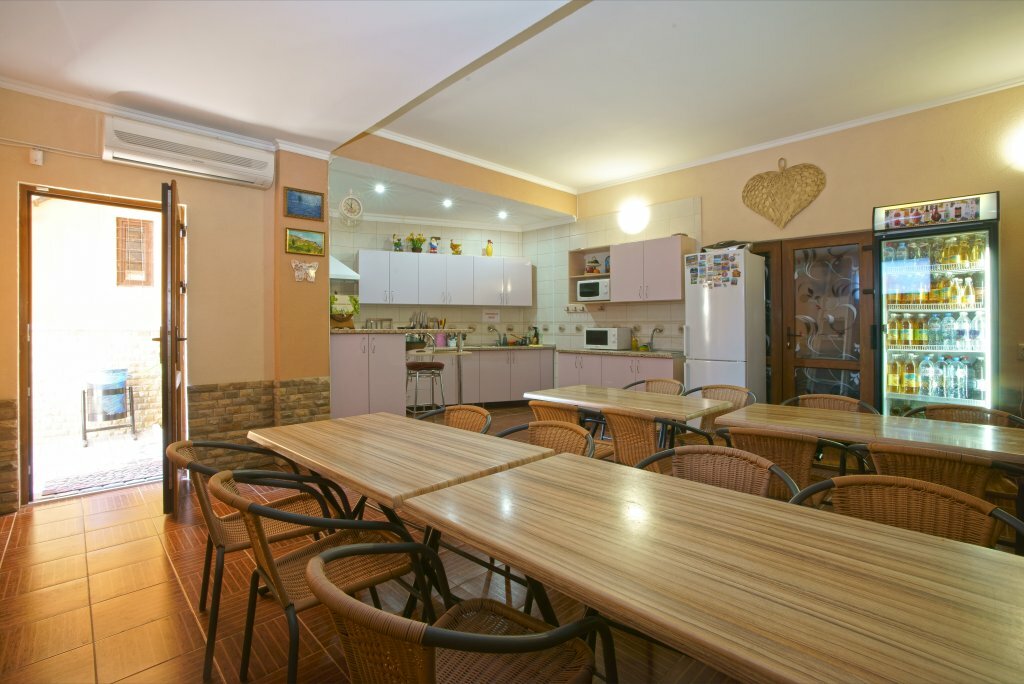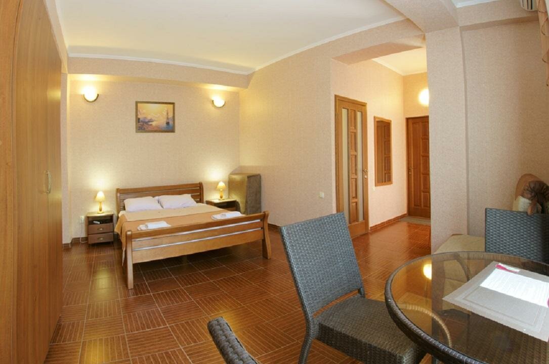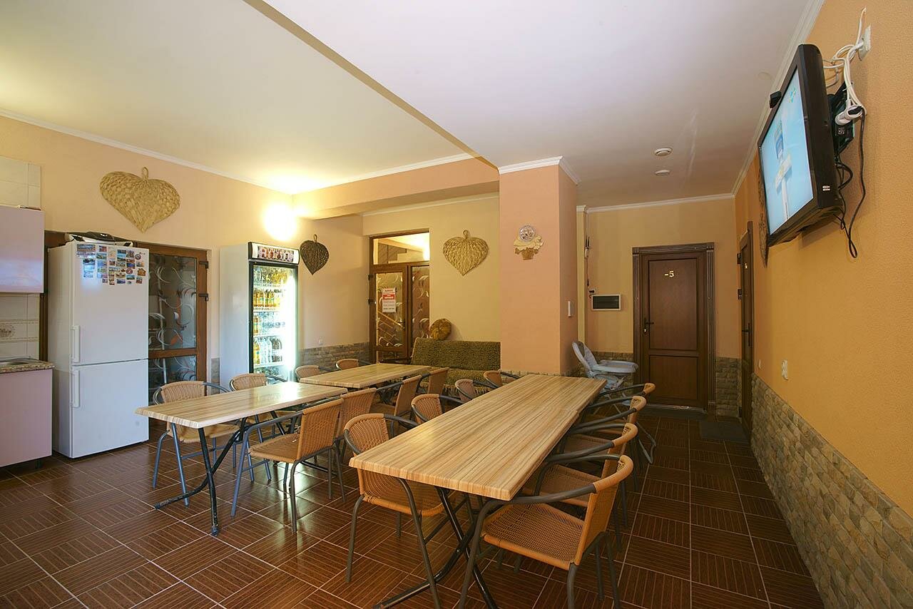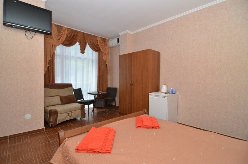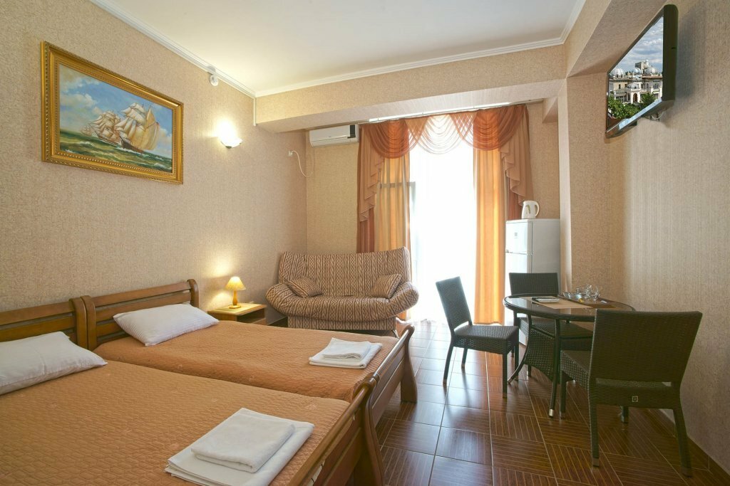 Удобства: — Номера с кондиционером, Wi-Fi, санузлом, холодильником, телевизором; — Бесплатная парковка, общая кухня, столовая, прачечная; — Собственный галечный пляж, детская площадка, терраса, сад; — Трансфер (платный), прокат авто, дайвинг, катание на лошадях.