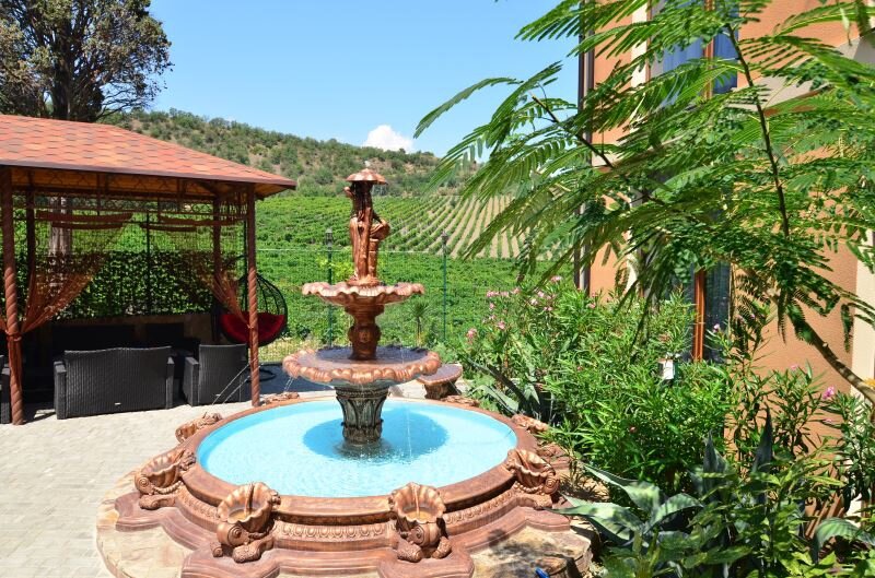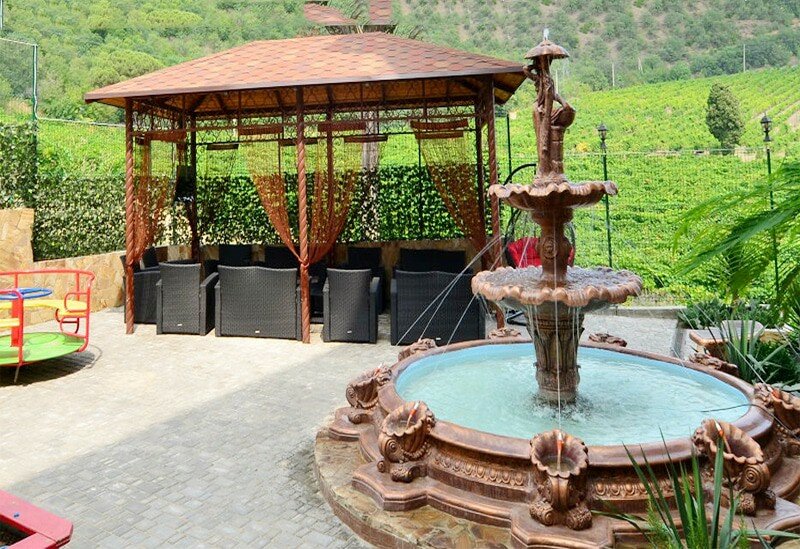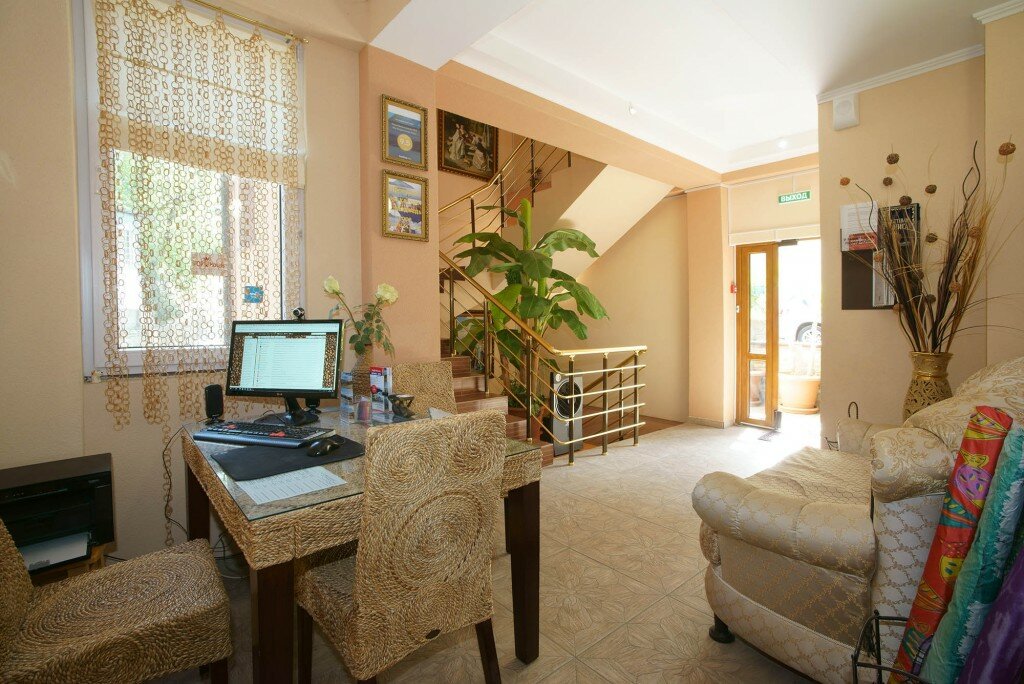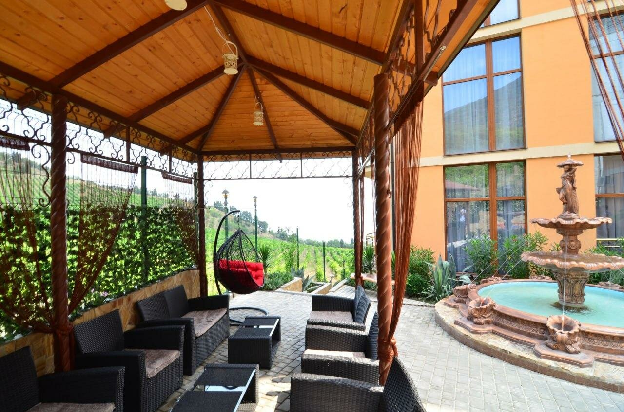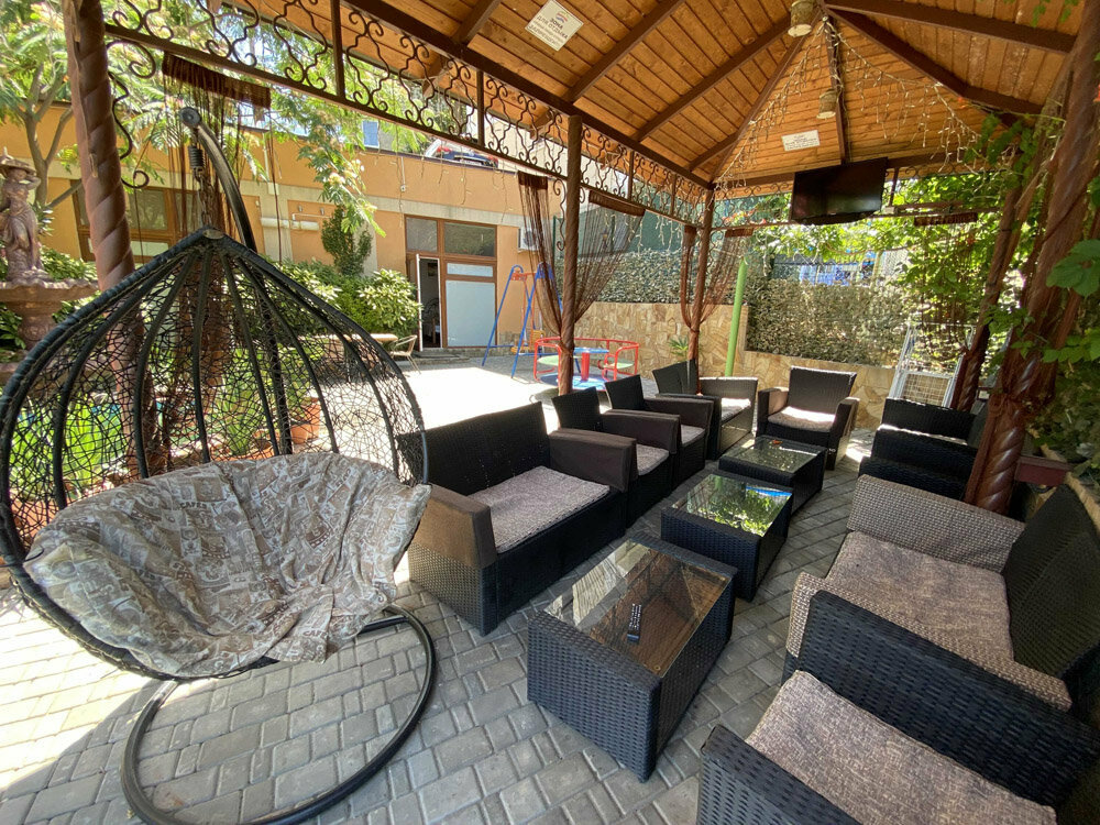 Удобства: — Номера с кондиционером, Wi-Fi, санузлом, холодильником, телевизором; — Бесплатная парковка, общая кухня, столовая, прачечная; — Собственный галечный пляж, детская площадка, терраса, сад; — Трансфер (платный), прокат авто, дайвинг, катание на лошадях.