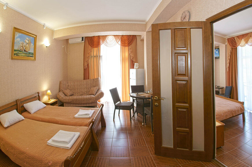 Уютный и просторный двухкомнатный номер с панорамными окнами и балконом. Вид из на море и виноградники.Номер данной категории подойдет для большой семьи,максимальное размещение 6 гостей.В номере: деревянная мебель из бука (двуспальная кровать и ...
