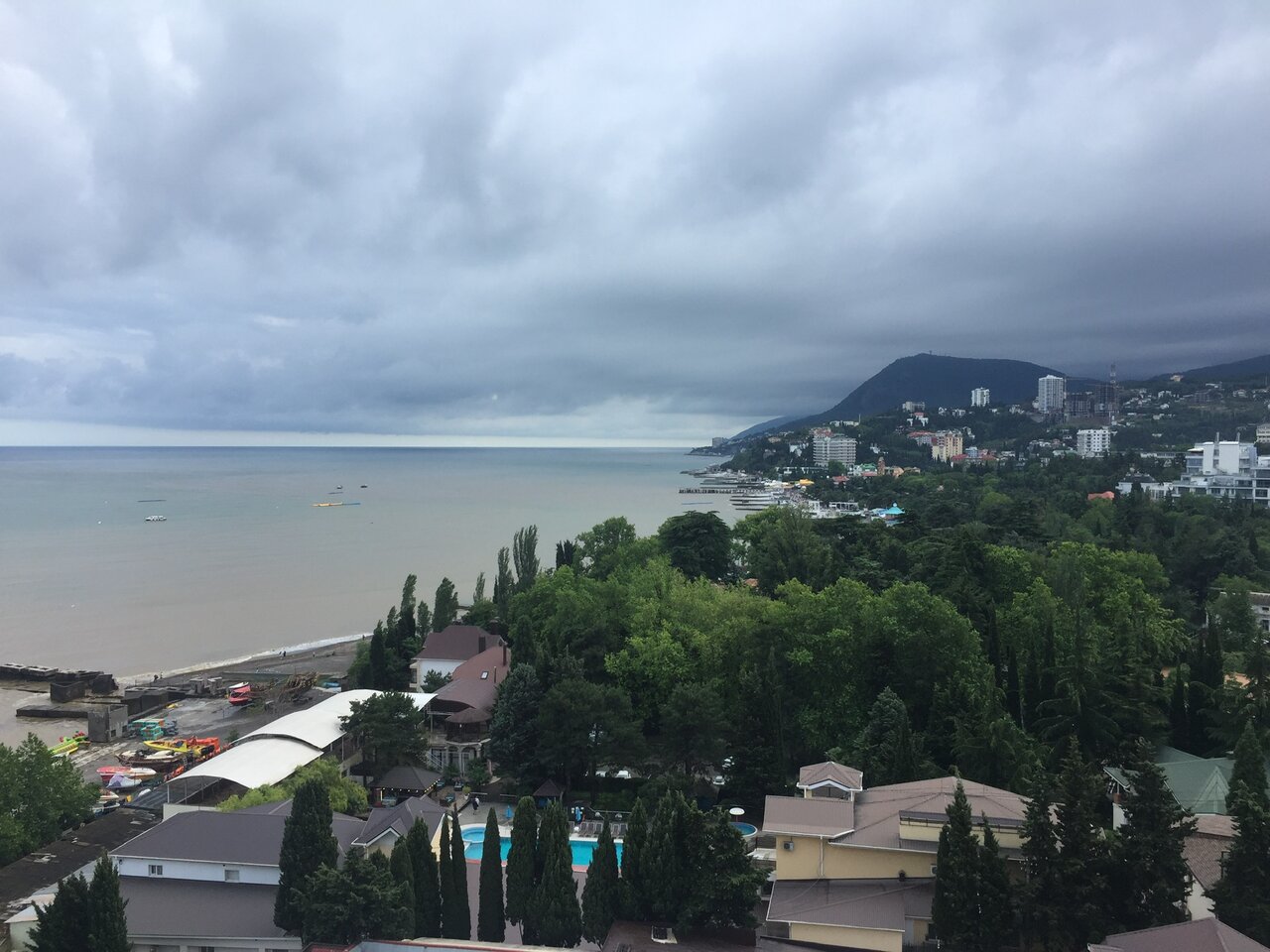 А вот сюда не надо. Старый советский отель. Вокруг разруха. До набережной недалеко, но напрямую пройти опять же сложно. Ибо через разруху. Завтраки? Такие же как отель. Есть ли что — то хорошее. Да! Вид на море! Из всех номеров! Из старых советских потертых номеров. Но на море. На это и купились. Но больше нет! Не единственный отель в Алуште!