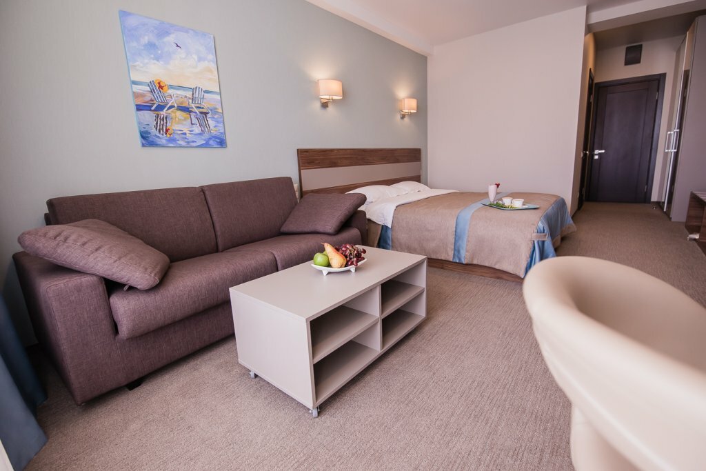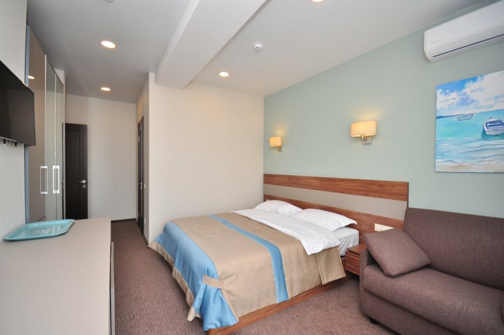 Удобства: — Номера с кондиционером, Wi-Fi, мини-баром, звукоизоляцией и видом на море. — 2 бара, ресторан, летняя веранда, открытый подогреваемый бассейн с баром. — Бесплатная парковка, трансфер (платный), прокат велосипедов и авто. — Услуги: массаж, консьерж-сервис, прачечная, организация праздников.