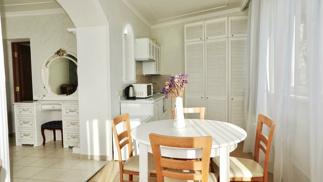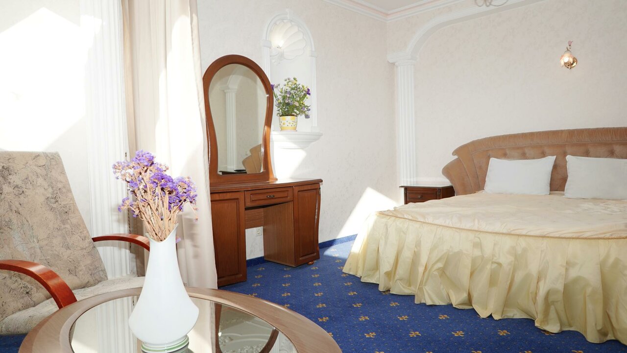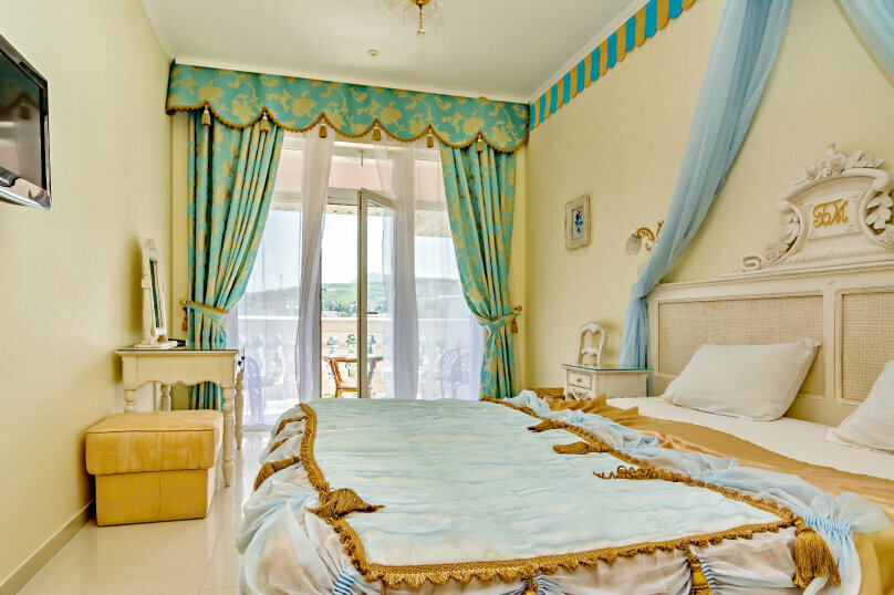 Однокомнатный номер во французском стиле с балконом. В номере двуспальная кровать, полный комплект мебели, ванная комната с ванной.