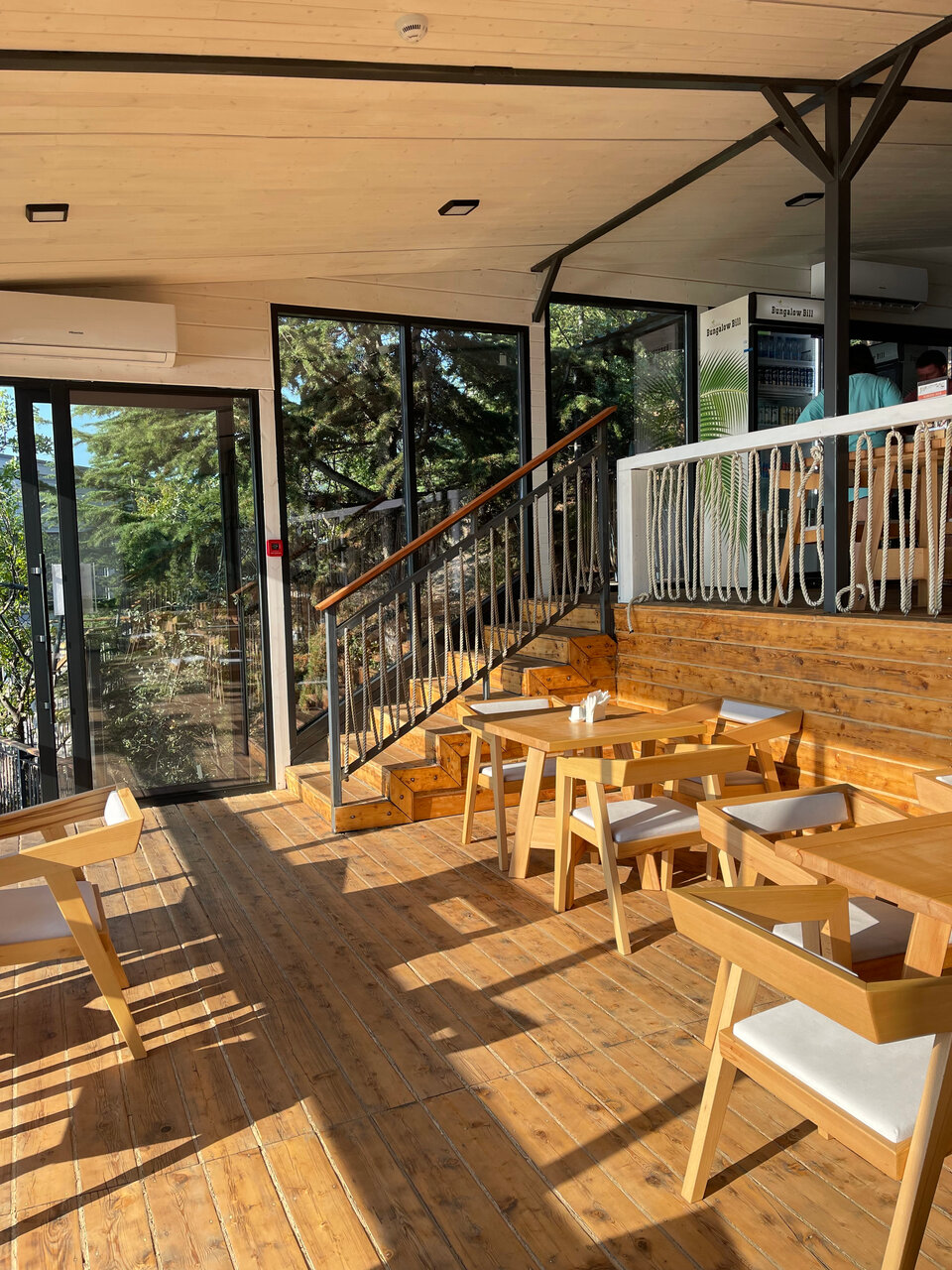 Местоположение отличное — набережная и море в шаговой доступности, как и аквапарк, рядом есть неплохие кафе/рестораны, с балкона открывается прекрасный вид на море, а территория комплекса вся засажена хвойными деревьями. Завтрак по системе ‘шведский стол’, часть позиций из меню менялось, готовили вкусно и обслуживание на кухне 5 баллов, официанты молодцы. К плюсам также можно отнести тишину — жили в одиночном бунгало, никаких посторонних звуков не слышали. Минус один — сервис оставляет желать лучшего — он по достоинству оценен на минус 2 балла. Администраторы не могли решить проблему со стойким запахом пропавшей рыбы от холодильника после предыдущих жильцов. По итогу, после двух дней разбирательств, холодильник был выставлен на улицу, администратор его забрал и обещал заменить на утро, но так и не заменил.