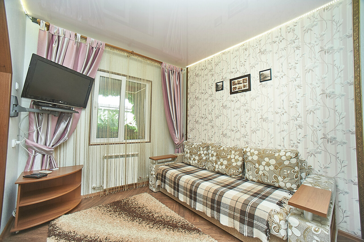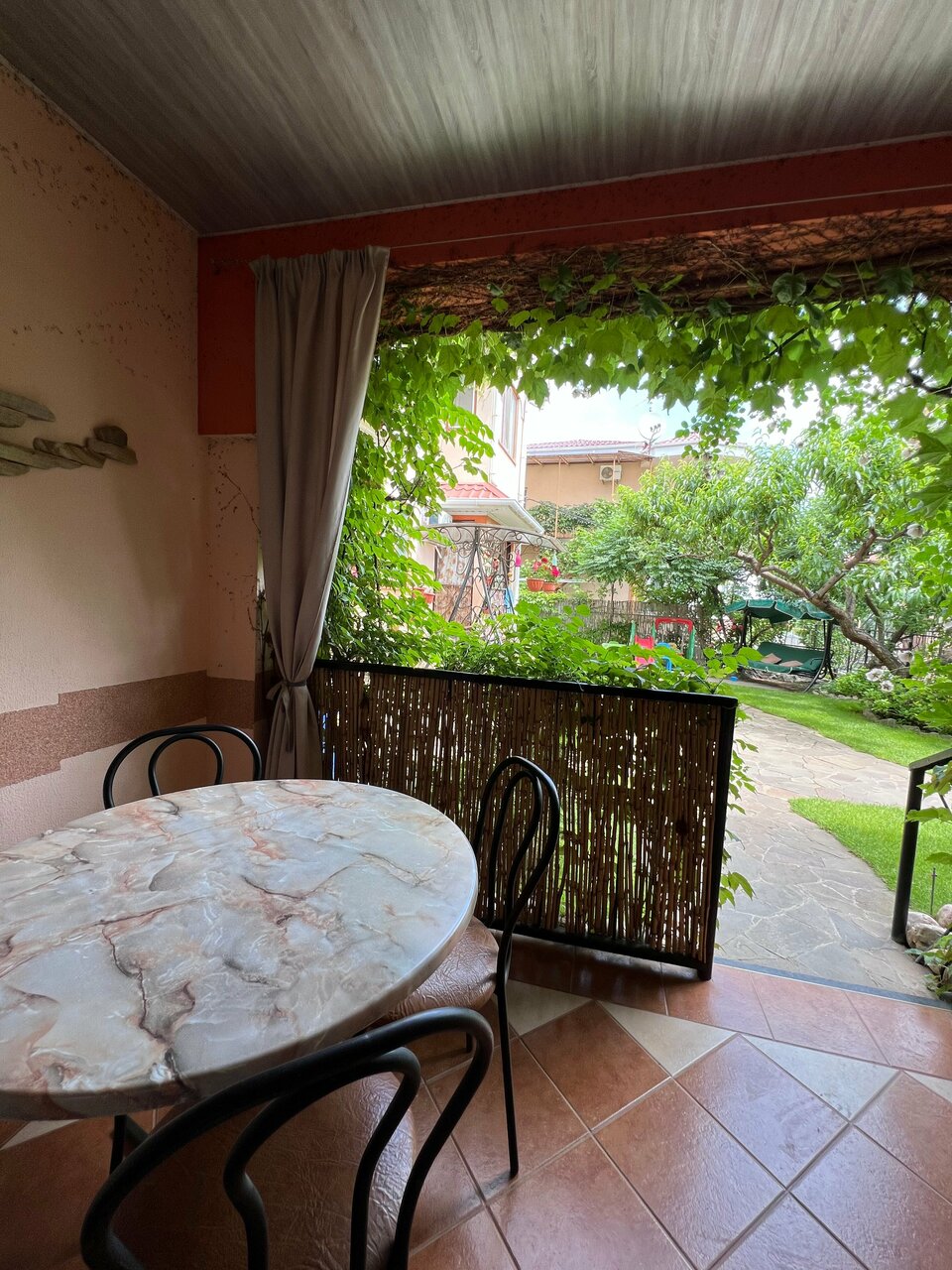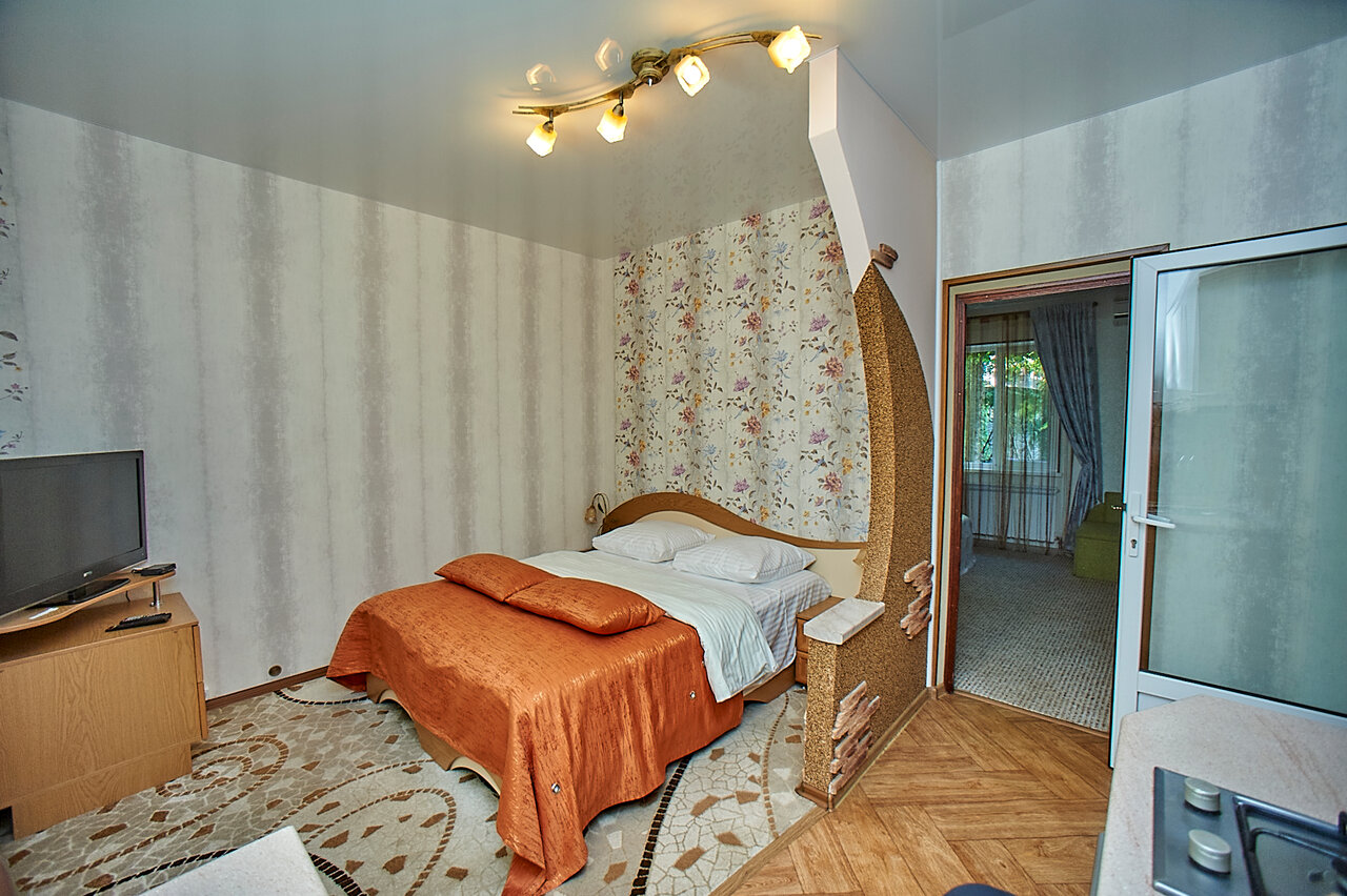 Отдыхали уже 3 раза. Чисто, уютно. В одном дворе несколько квартир, но ощущение, что живешь уединенно из-за расположения квартир и большого количества зелени: деревья, цветы, плетущийся декоративный виноград, несколько зон отдыха: свои балконы, в разных уголках качели и лежачки Даже два детских спортивных уголка! А также шикарный большой стол под навесом и крутой каменный мангал! Есть возможность гулять по территории санатория в зелени и тишине. А если захочется активности, в пансионате есть спорт площадки. Из минусов, кому-то может показаться наличие большого количества лестниц, при возвращении с моря, но это кому-как. Мне нравится нагрузка, поэтому для меня это плюс. А еще с некоторых номеров — шикарнейшие виды с балкона, огромные окна с видом на зелень и птицы — громко поющие, как будто без перерыва 🙂 Есть столовая рядом, готовят хорошо, но это в сезон. А еще замечательные добрые хозяева! Хочется вернуться сюда снова!