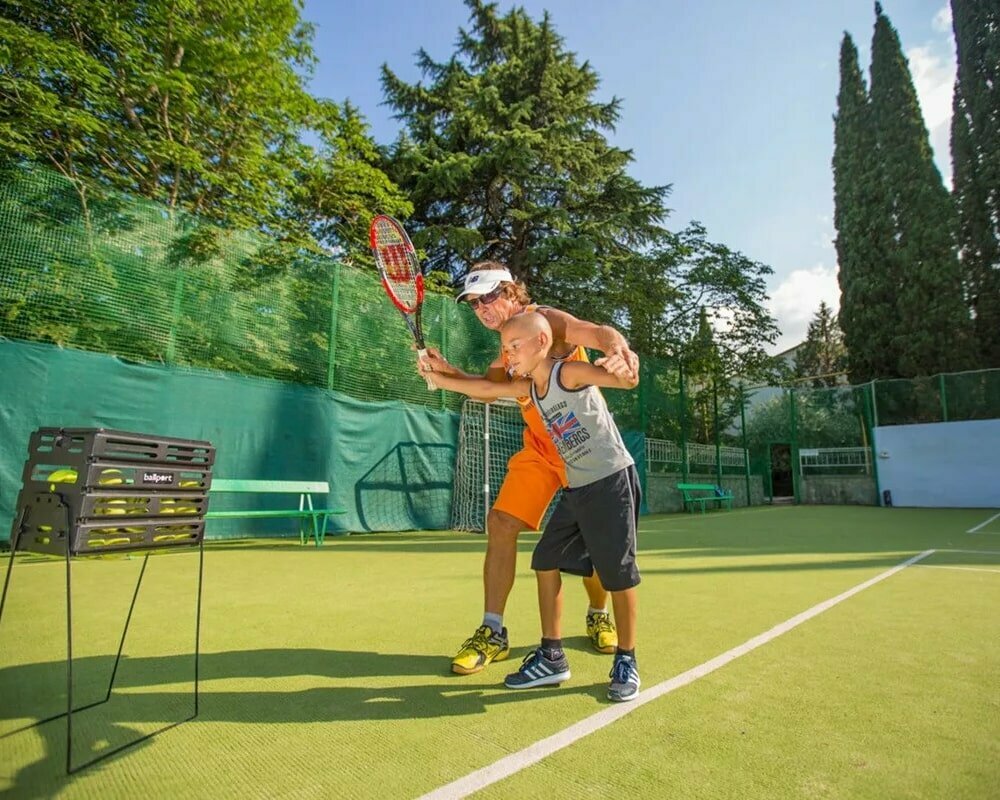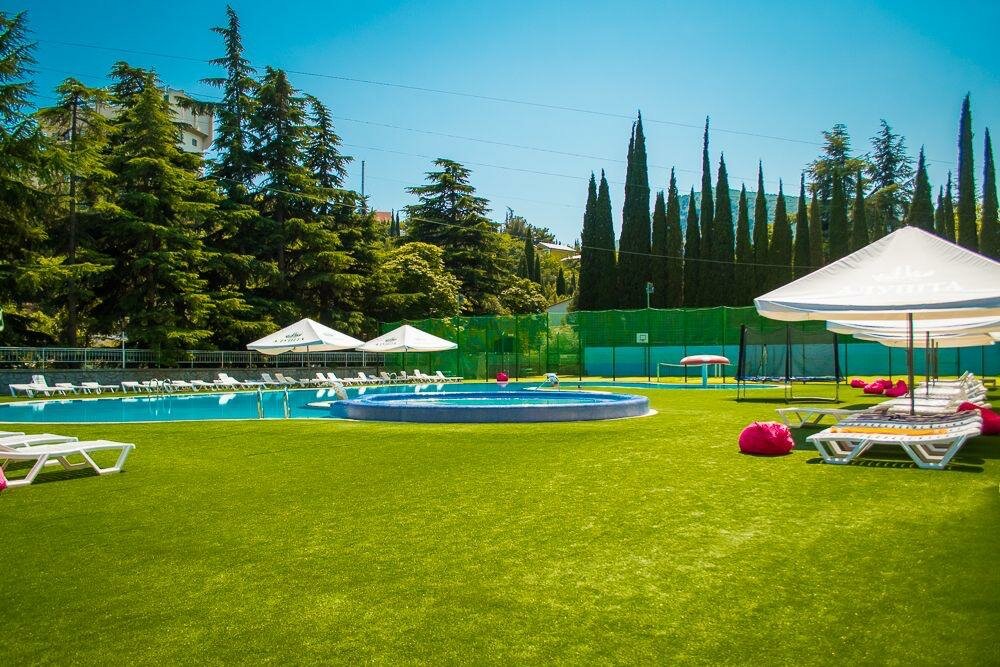 - Ухоженная, зелёная территория с множеством растений.; Большой стол под навесом и каменный мангал.; Хорошая столовая в сезон.; Возможность прогулок по территории санатория.; Детские и спортивные площадки.