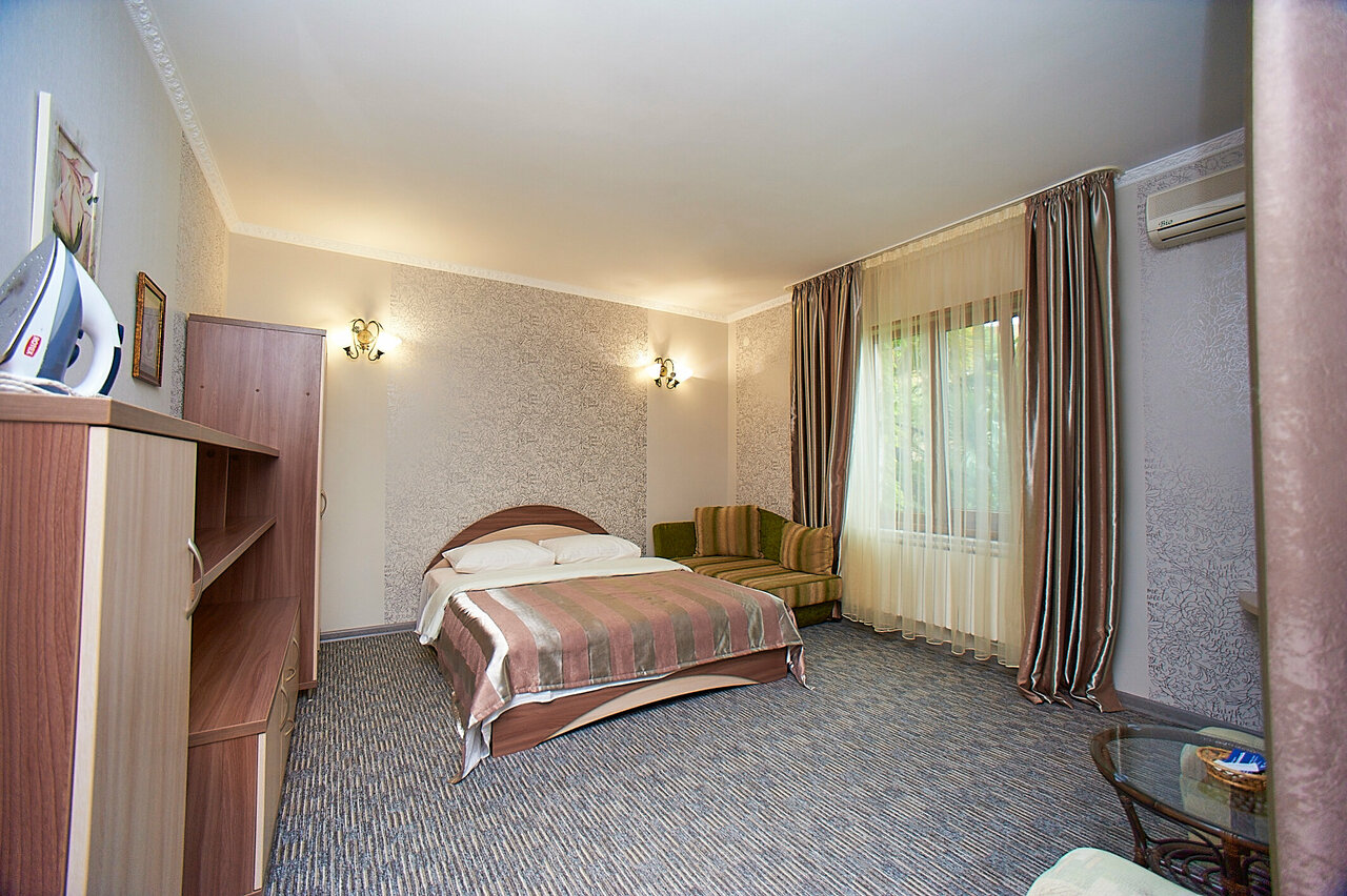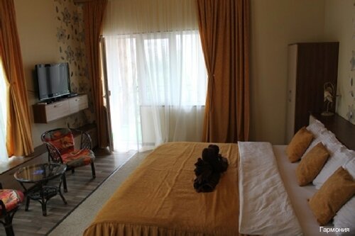 Гармония-отличное место для отдыха. Очень красивая, ухоженная территория, всё в зелени. Чистые, современные номера, есть всё, что нужно. Телевизор, кондиционер, холодильник, чайник,фен,сейф. Если вы захотите приготовить покушать есть большая кухня со всем необходимым, и тут же классный мангал с большим столом. Так же рядом есть домашняя столовая где можно вкусно покушать. Большой плюс проход по территории санатория, и за приемлимую цену можно пользоваться бассейном. Светлана и Иван прекрасные люди, всё расскажут, покажут, подскажут куда лучше сходить или съездить. По их совету съездили на дикий пляж, вода там лазурная, очень тёплая. Мы останавливались в двух однокомнатных номерах’стандарт’, все фото на сайте соответствуют. Подъём по ступенькам к отелю нисколько не смущает, своего рода фитнес. Если ехать в Алушту, то только в Гармонию. Спасибо за наш прекрасный, незабываемый отдых.