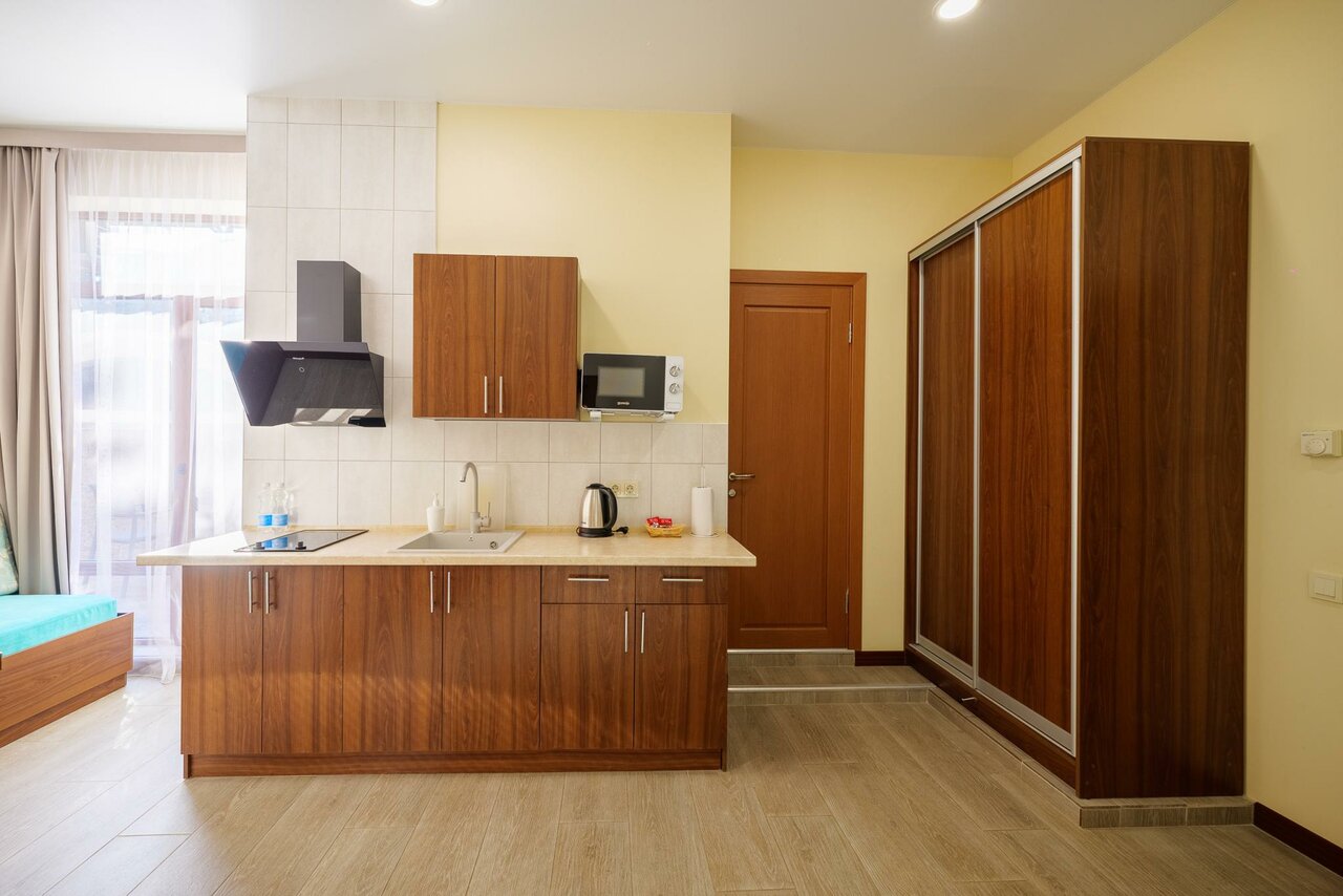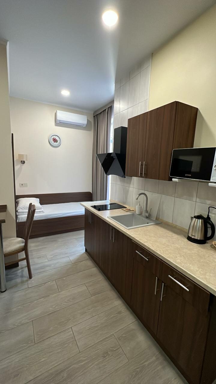 Корпус 'Б'.Двухкомнатный номер-студия с кухней - идеальный выбор для семьи!В номере 1 двуспальная кровать, 1 односпальная кровать и 1 тахта (в которой используется полноценный ортопедический матрас). Мини-кухня с двухконфорочной газовой плитой.