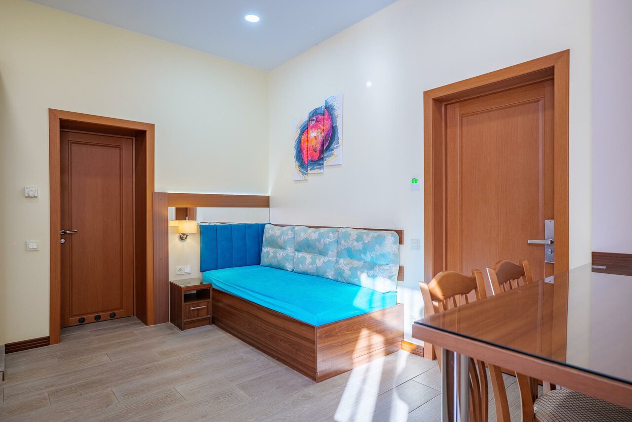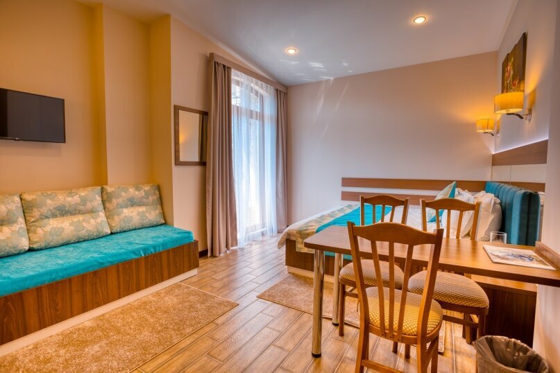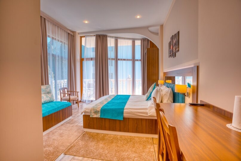 Корпус 'Б'.Просторный номер с небольшим балконом и видом на море.В номере 1 двуспальная кровать и тахта (в которой используется полноценный ортопедический матрас).В стоимость входит посещение SPA-зоны с 10:00-17:00 ежедневно.