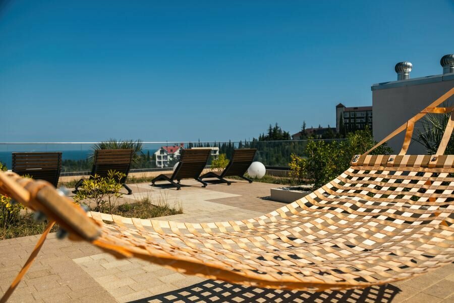 - Хороший сервис (включая прохладные номера в жару).; Просторные апартаменты с террасой.; Удобное расположение (близко к морю, инфраструктуре).; Завораживающие виды на море и горы.; Большие балконы с лежаками.