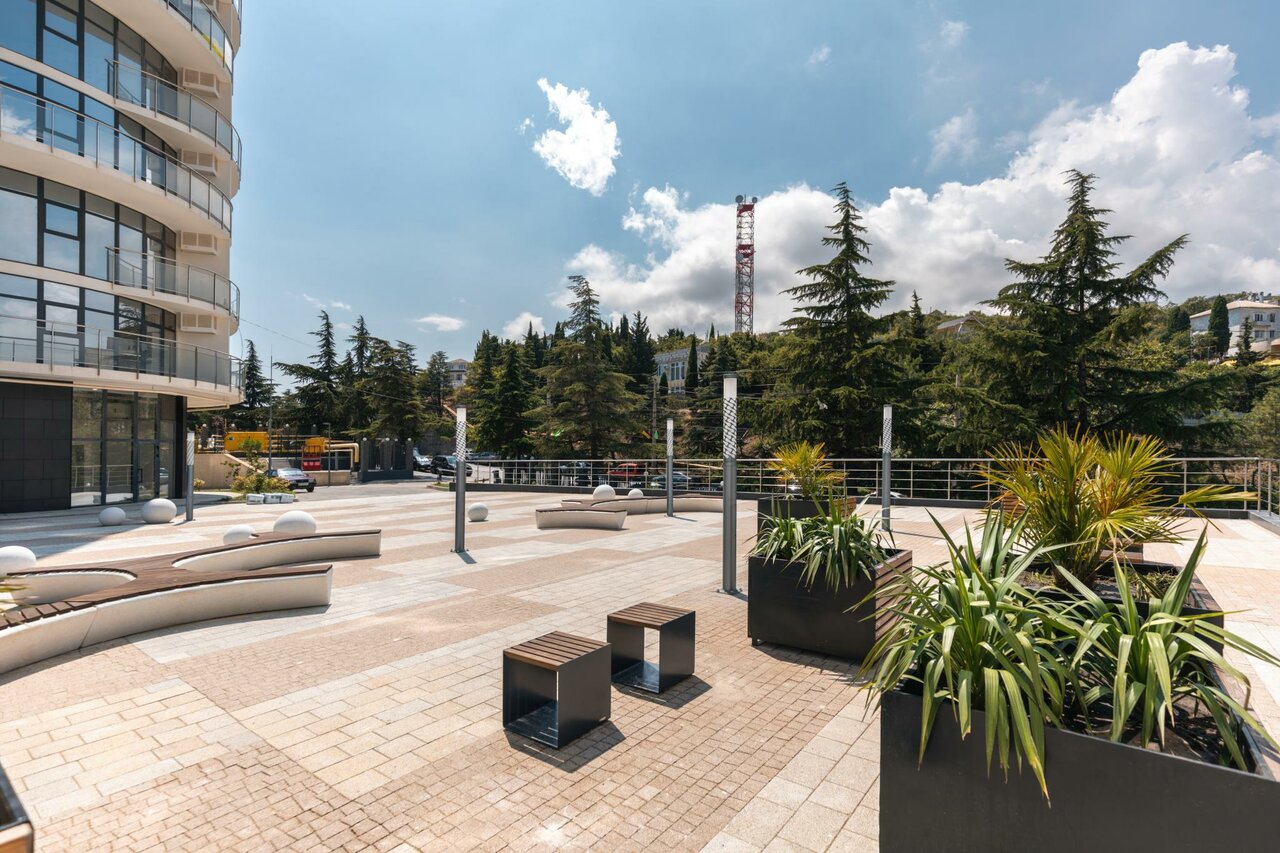 Отдыхали в июне в корпусе Грибоедов, современные, стильные апартаменты, имеется все необходимое для полноценного отдыха. С балкона открывается потрясающий вид на горы и море! Территория ухоженная, есть где погулять и посидеть вечером ! Расположение удобное, до моря можно спуститься пешком по лестнице либо доехать на троллейбусе (остановка прямо рядом) !