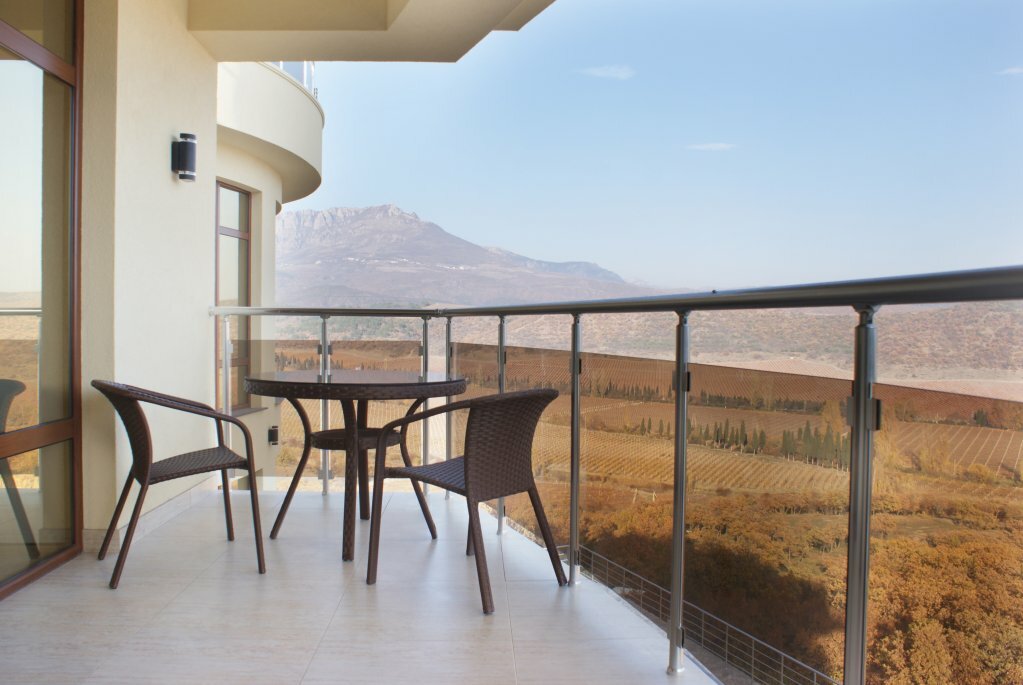 Отличный номер люкс, но чайник не предусмотрен и вода тоже. Безупречный вид на горы и виноградники, но маленькая территория и сложный подъезд к отелю. В ресторане все вкусно, но на 3 персоны наливают чайник чаю, которого хватает еле еле на 2,5 чашечки. Все честно.