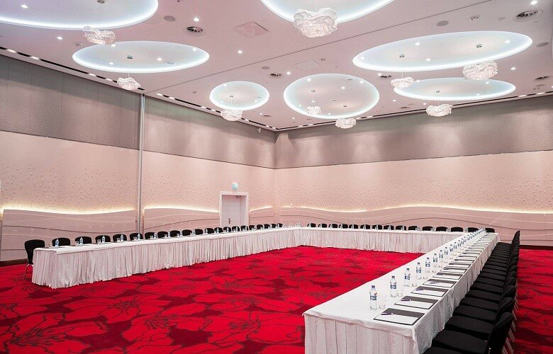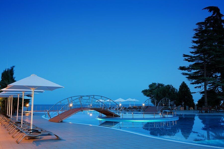 Удобства: — Открытый и крытый подогреваемые бассейны, spa, тренажёрный зал, сауна, хаммам. — Собственный галечный пляж, шезлонги, бар у бассейна и на пляже. — Рестораны (3), кафе, бары (3), питание по системе «всё включено» или полупансион. — Бизнес-центр, конференц-залы, коворкинг, бесплатный Wi-Fi. — Детский клуб, анимация, игровая комната, услуги няни. — Трансфер (платный), парковка (бесплатная), прокат авто.