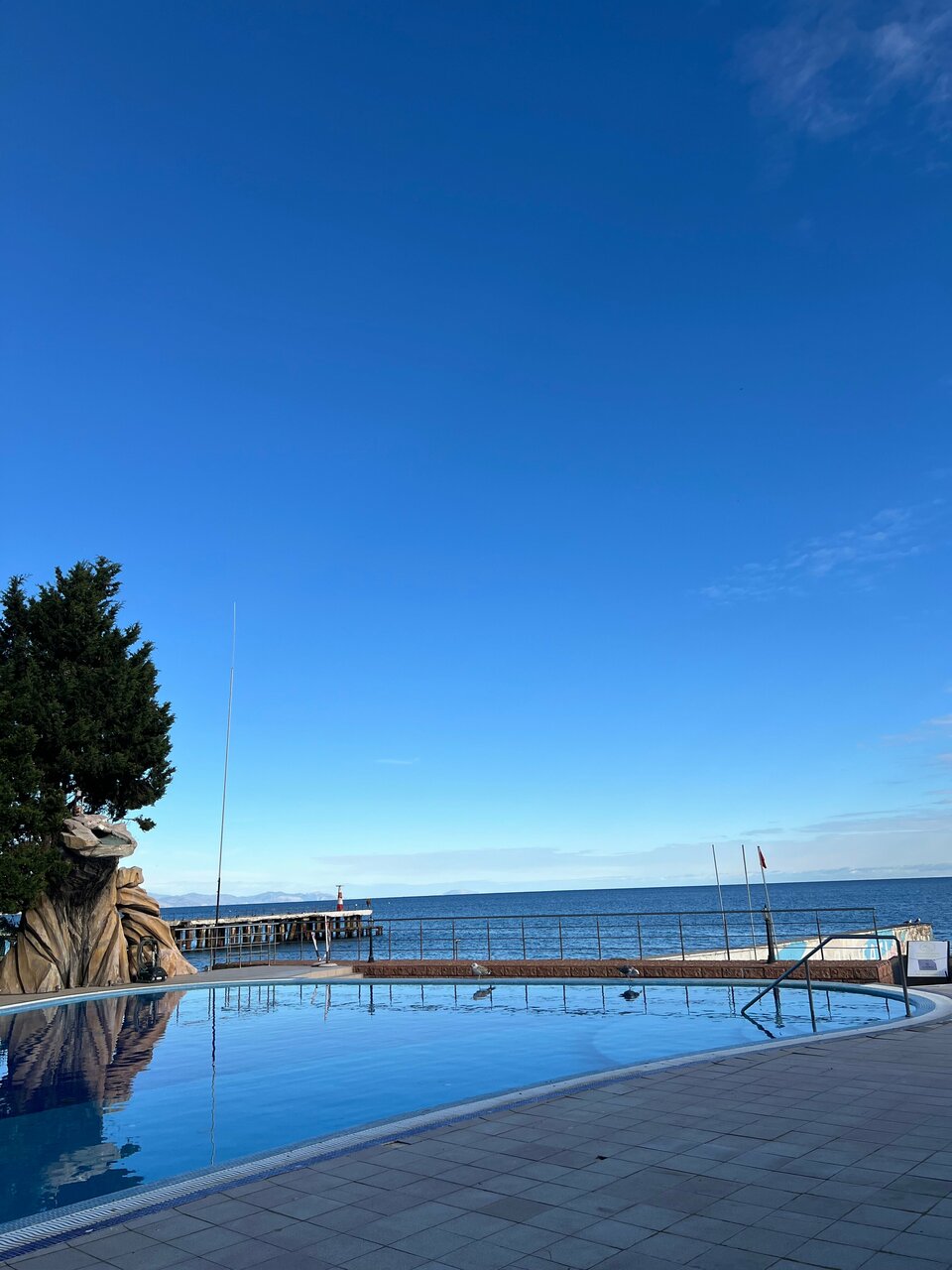 В целом отдых понравился. Из того, что хотелось бы улучшить: мебель в номере не совсем функциональная, не хватает тумбочки, а не столика, возле кроватей. В шкафу неудобные верхние полки, есть только вешалки для одежды. Посещение SPA-комплекса входит в стоимость номера, но посетить его оказалось непросто, и это не в сезон. Очень он маленький, а людей было много. Пришлось прийти в другое время. И при такой проходимости нет перерыва на сан. обработку. Боюсь представить, что там делается летом!!! Лучше уж его сделать платным. В остальном все было на высшем уровне! Шведский стол — вкусно и разнообразно. Бассейн прямо у моря, пляж, территория у отеля — все красивое и ухоженное Вид с балкона на море