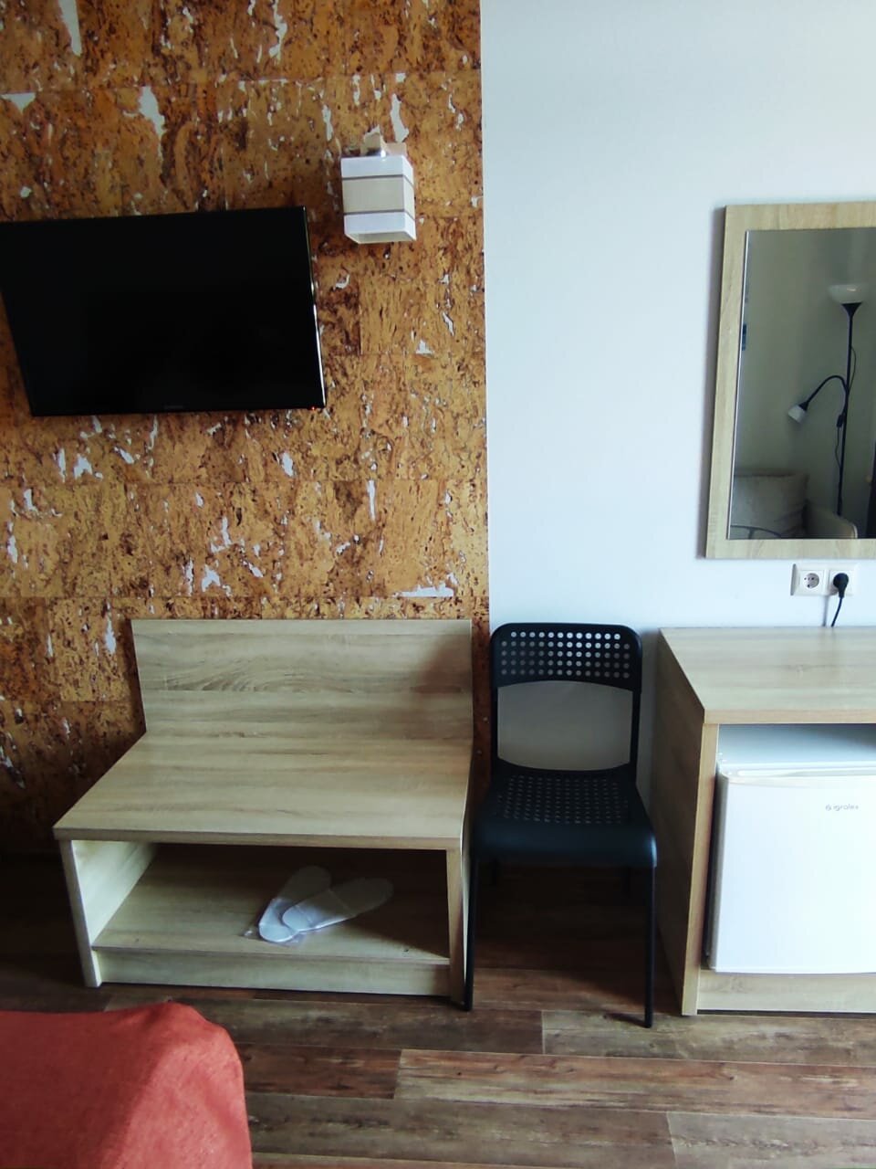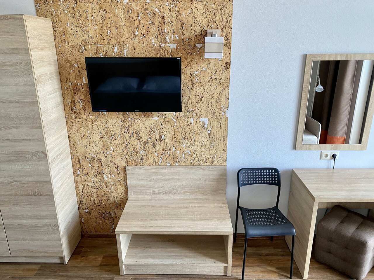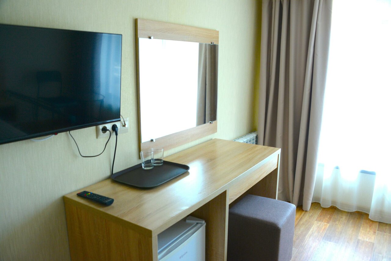 Номер Стандарт: одна двуспальная кровать или две односпальные, санузел с душевой кабиной, фен, телевизор, Wi-fi, холодильник, небольшой балкон или выход во внутренний дворик, северная сторона.