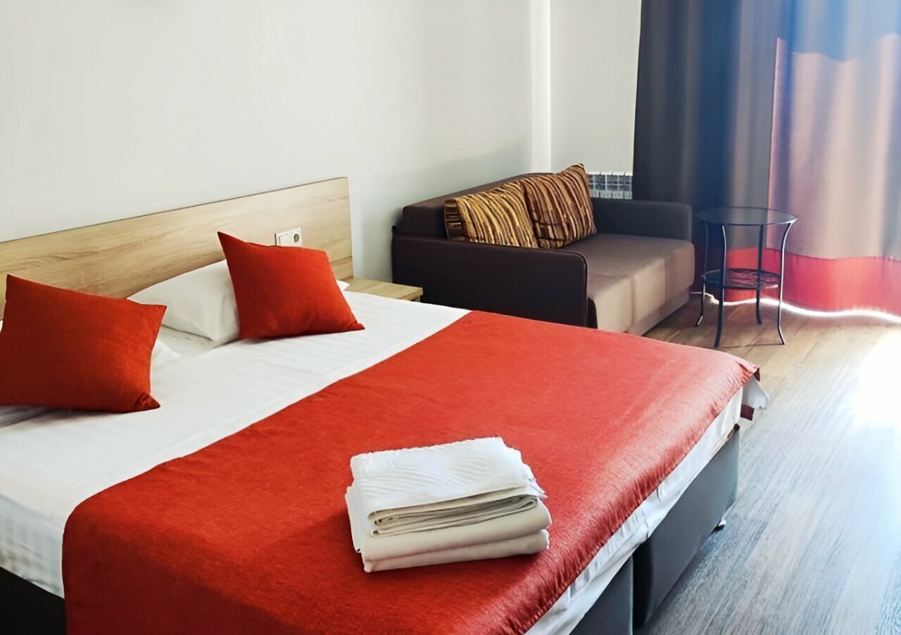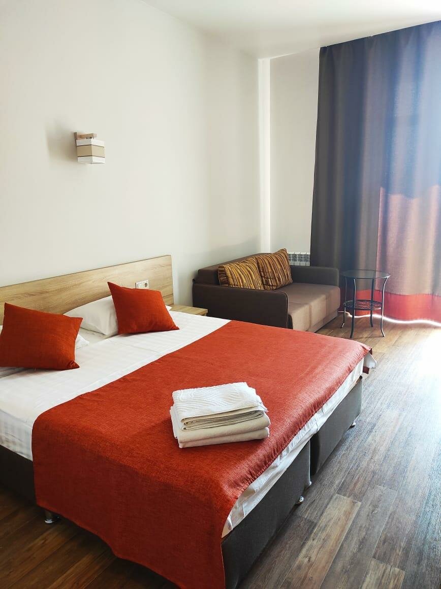Номер студия на 4-5 человек, 36м2.Оборудование: двуспальная кровать, односпальная кровать, диван-кровать, кресло-кровать, санузел с душевой кабиной, фен, кондиционер, телевизор, Wi-fi, кухня, холодильник, вид на улицу.