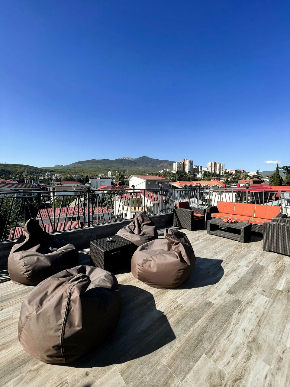 - Современный ремонт в номерах.; Красивый вид на город с террасы.; Наличие всей необходимой техники (кондиционер, холодильник, телевизор).; Доступные цены.; Чистота и порядок во всех помещениях.