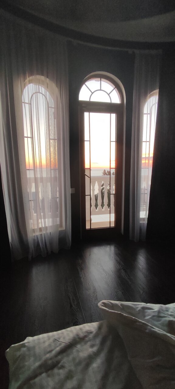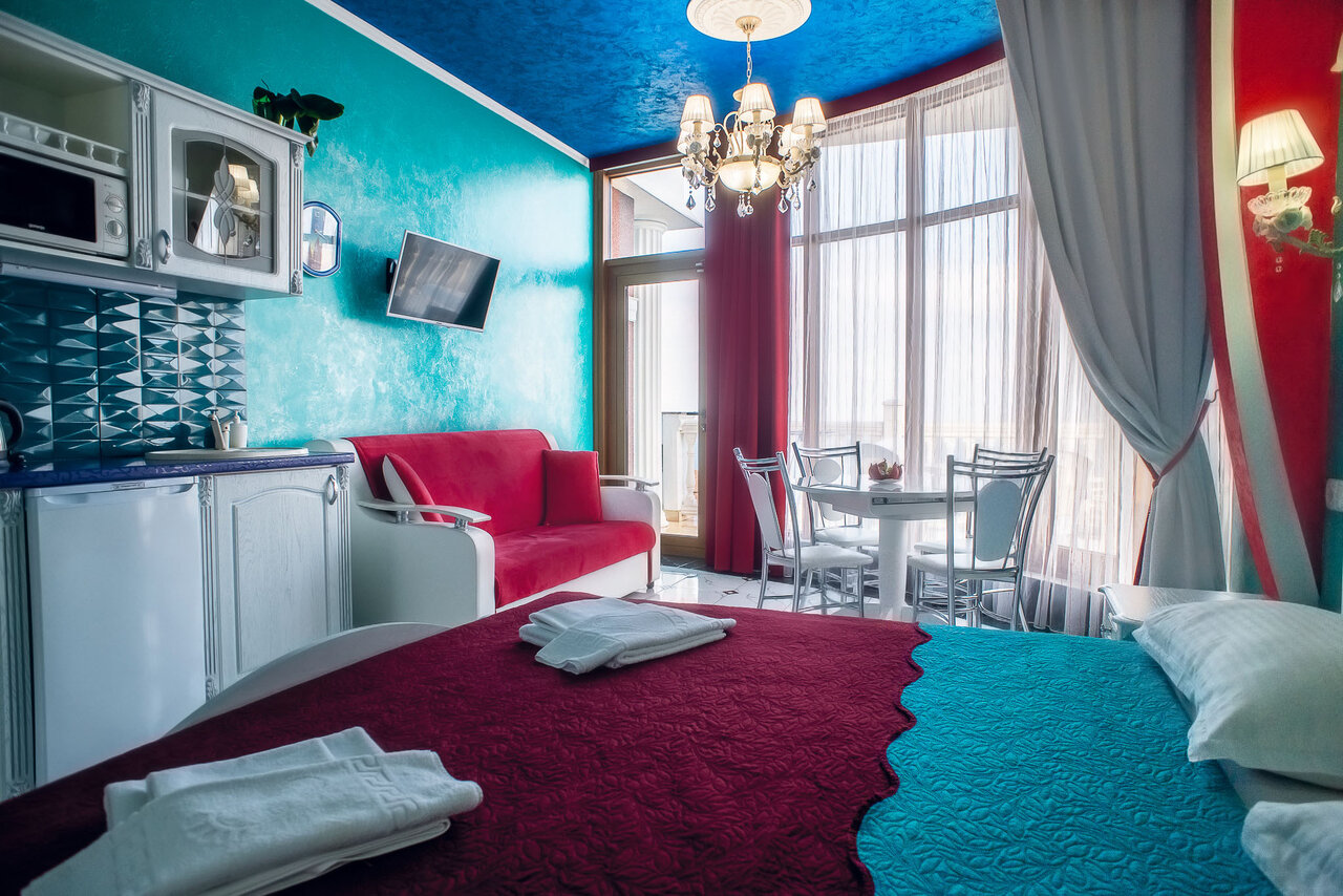 Двухкомнатная студия с видом на море и панорамными окнами, с балконом, в проживание включен завтрак, персональное посещение СПА, бесплатное пользование мангальной зоной, уборка производится ежедневно.