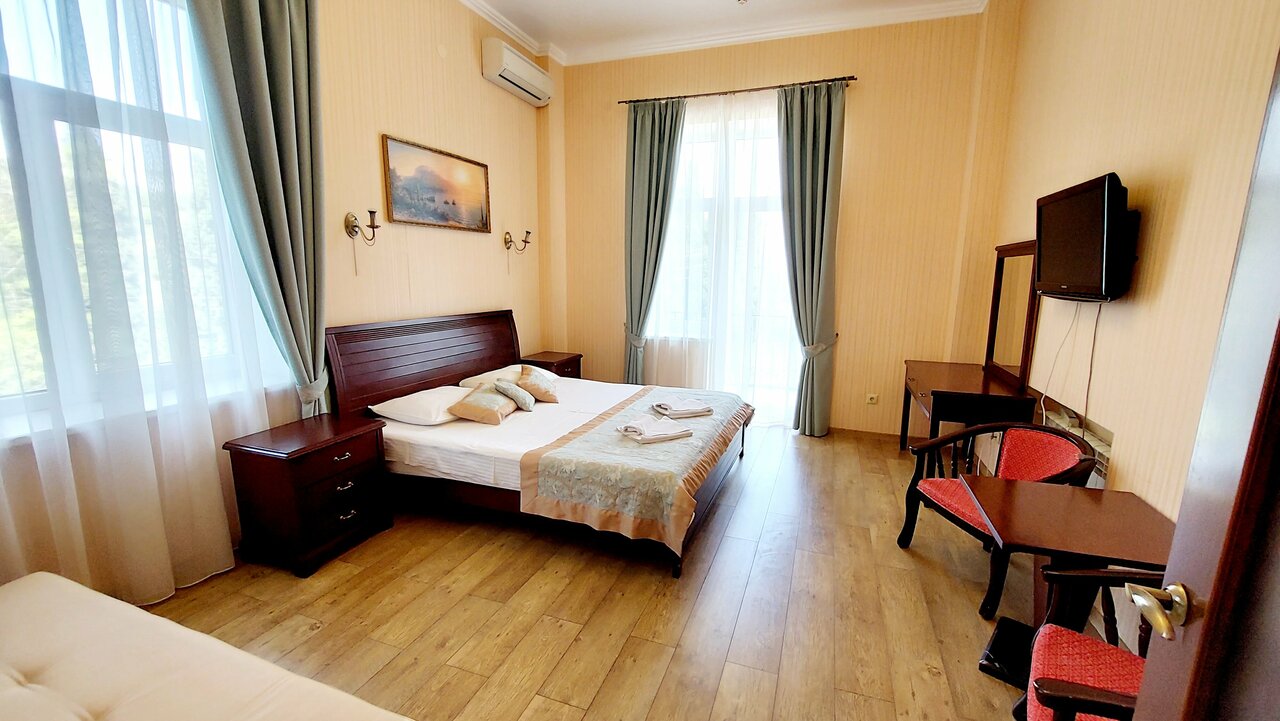 Отдыхали в конце сентября — начале октября 2023 г . Номер полностью соответствует фото. Цена более чем приемлемая. Красивое место, тихое, шикарный воздух . Набережная и пляж близко, много магазинов и кафе рядом. Очень приветливые администраторы. Небольшой минус — это крутой заезд на территорию если ехать на авто , не очень удобно. но плюсы этого места перевешывают