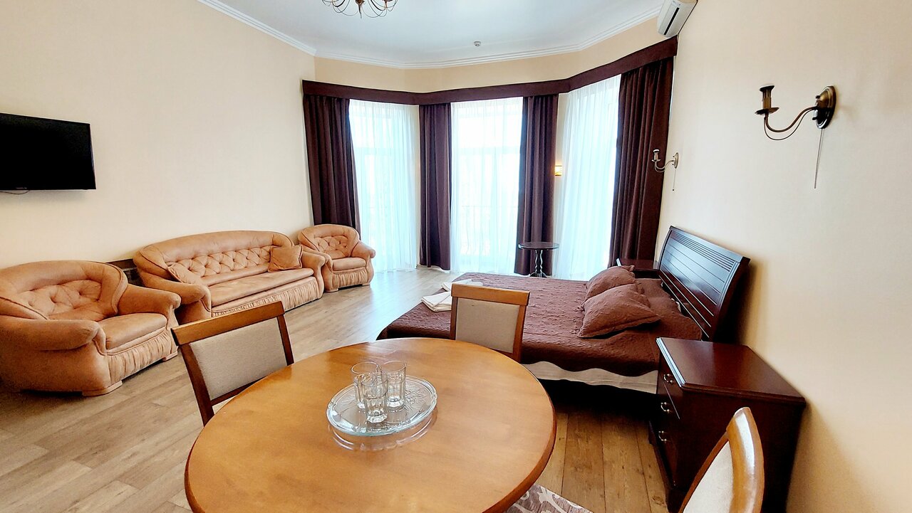 Однокомнатный номер площадью 40 м2 с двуспальной кроватью и гостевой зоной, диваном и журнальным столиком, создан для незабываемого отдыха наших гостей. Комфорт создают мебель из натурального дерева и элегантный дизайн. Ванная комната укомплектована