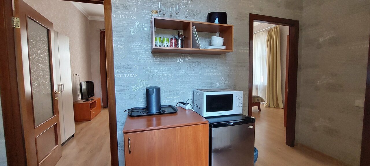 Двухкомнатный номер с кухней, площадью 41 кв.м., состоит из гостиной с кухней, элегантной спальни, прихожей и ванной комнаты. В этом номере есть все для истинных ценителей комфорта, имеет дополнительный выход 'итальянский дворик'.