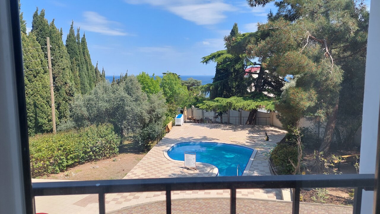 Огромный номер с видом на море. Парковка на территории. Кому не хватит места или не удобно будет в горку карабкаться, рядом есть 2 платные. До пляжа минут 10. До столовых на любой вкус и кошелёк — ещё ближе. Рекомендую, однозначно.