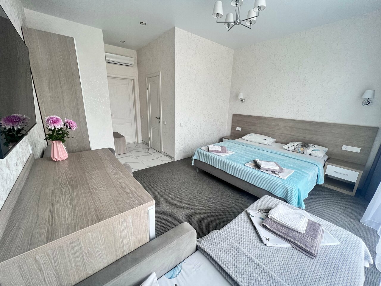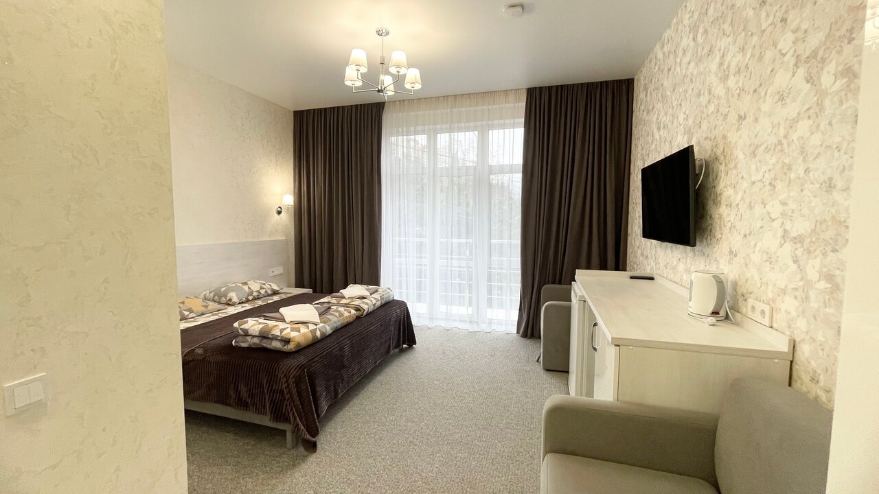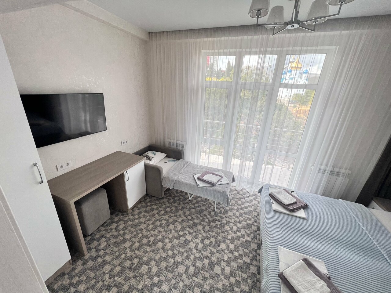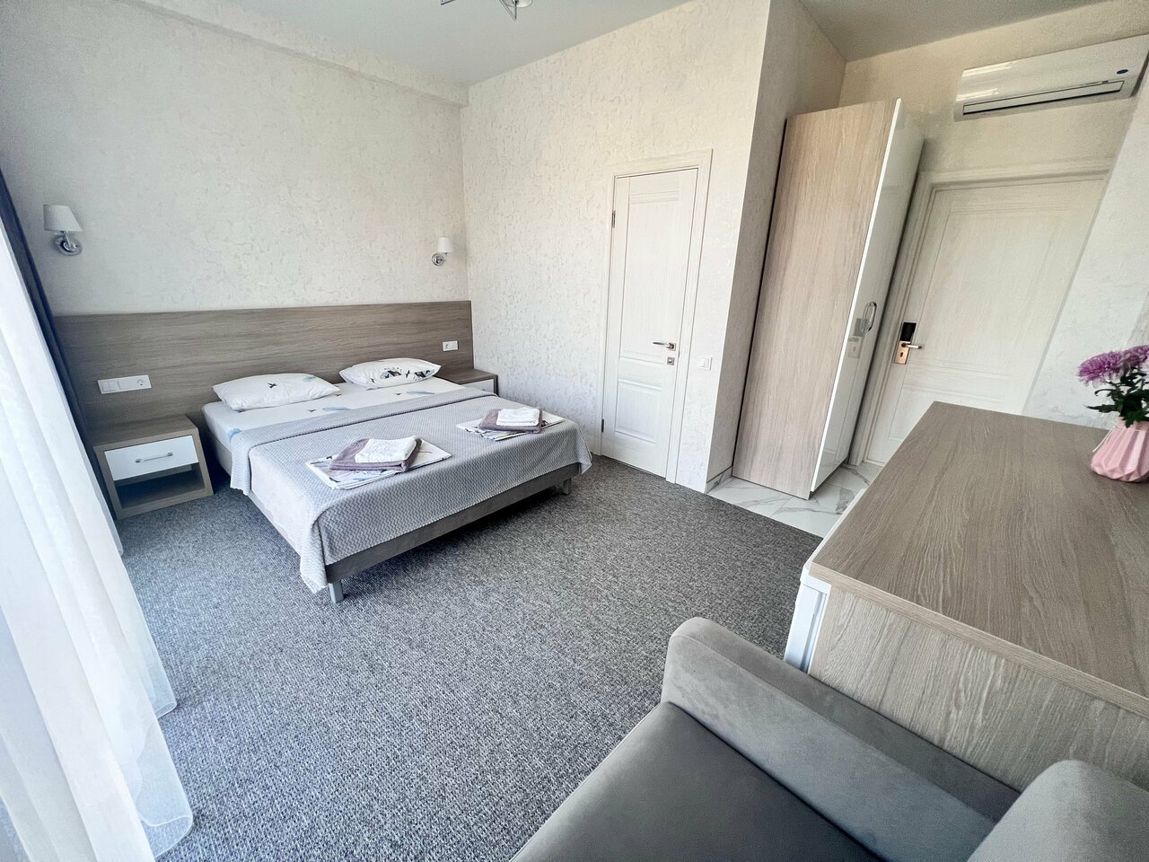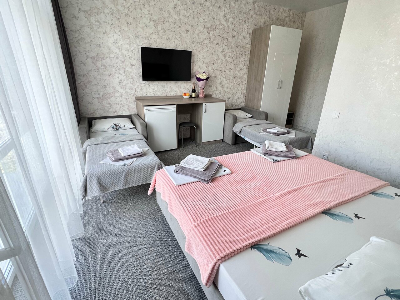 Просторное помещение для четырех человек. В комнате двухспальная кровать и два раскладных отельных кресла ,тв со спутниковыми каналами , холодильник, кондиционер. Централизованное отопление. Душ и туалет. Балкон.