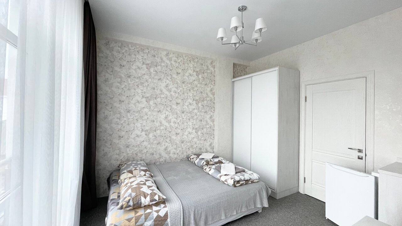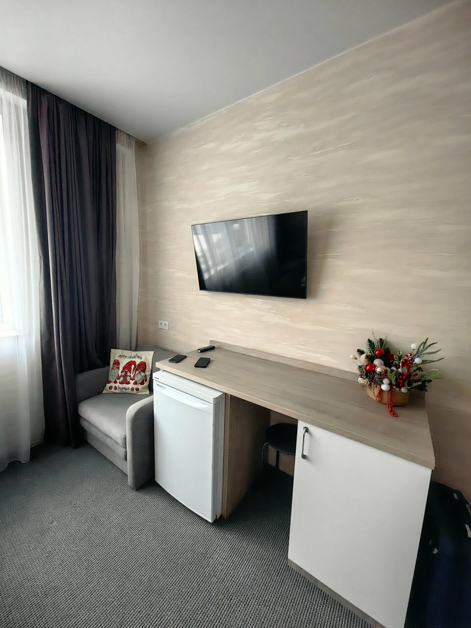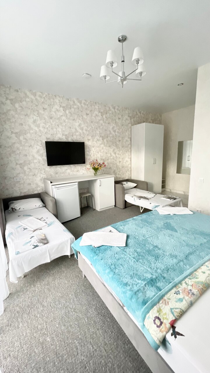 Просторное помещение для трёх человек. В комнате двухспальная кровать и раскладное отельное кресло , тв со спутниковыми каналами ,холодильник,кондиционер. Централизованное отопление. Душ и туалет.