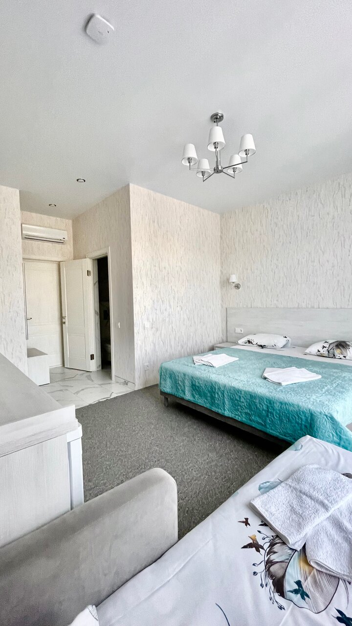 Просторное помещение для четырех человек состоит из двух комнат. В одной комнате двухспальная кровать ,тв со спутниковыми каналами , холодильник, кондиционер. Во второй- две односпальные кровати (или отельный диван) и раскладное кресло. Централи...