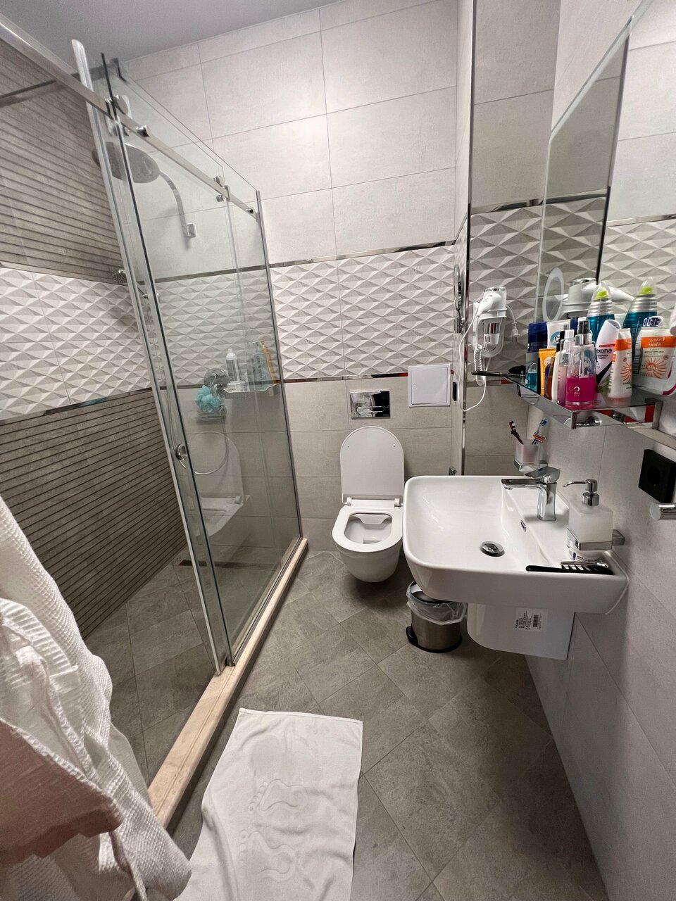 Санузел: душевая кабина, унитаз, гигиенический душ.1. Комната: кровать king size bed, телевизор, кондиционер. Балкон.2. Комната: СВЧ печь, чайник, телевизор, кондиционер. Балкон.