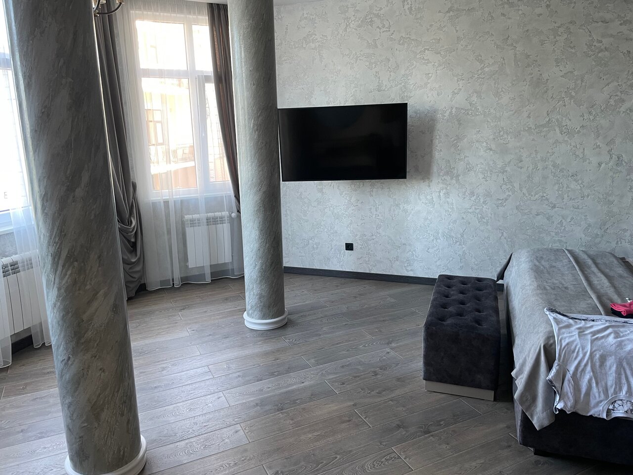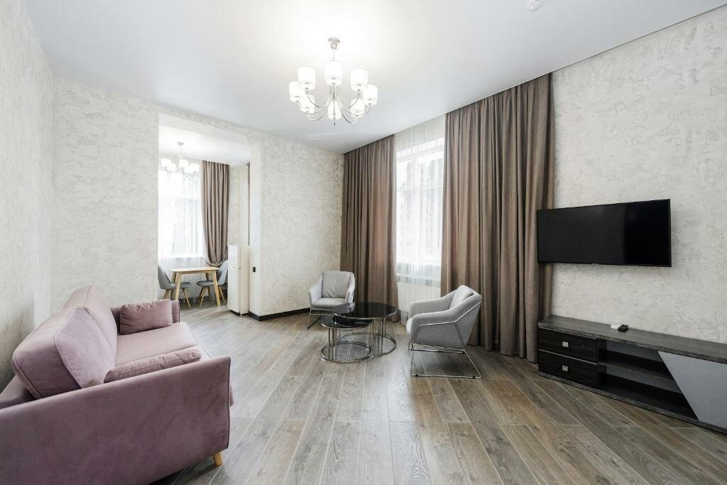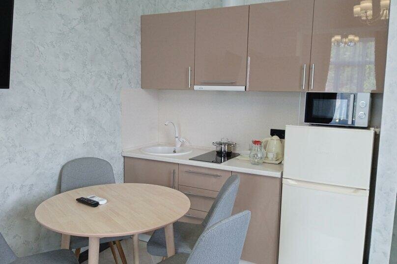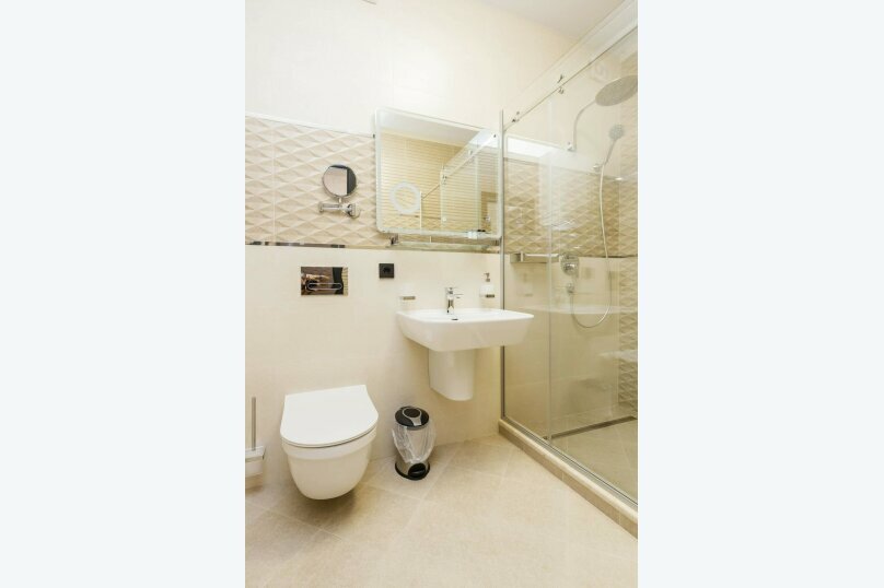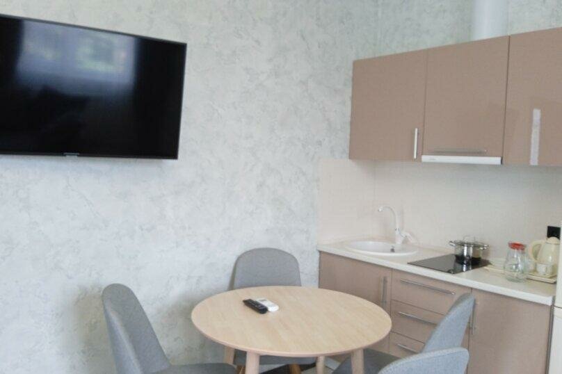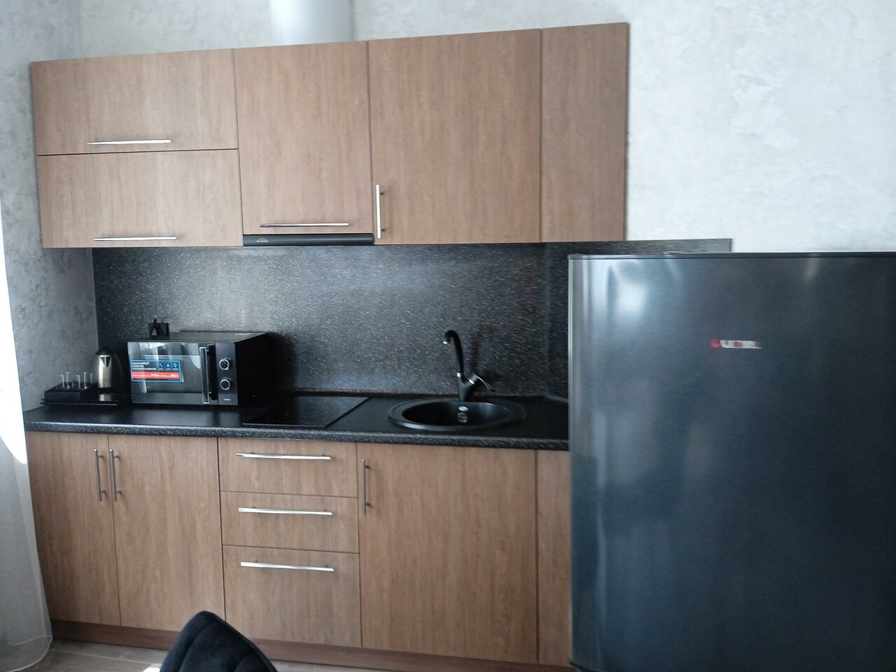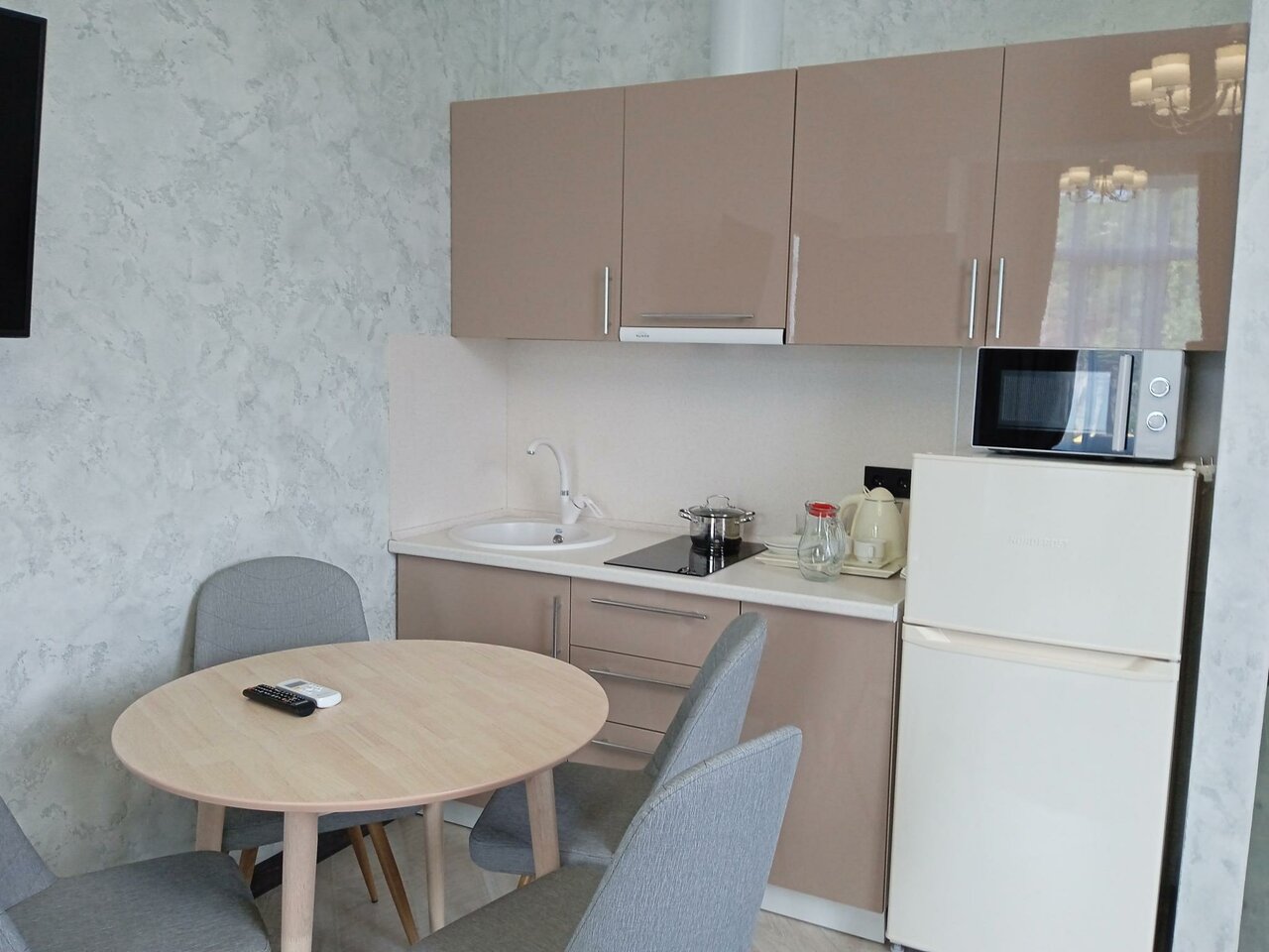 Санузел в номере.Комната: кровать king size bed, двуспальный диван, шкаф. Кухня: варочная поверхность, СВЧ печь, чайник, холодильник, кондиционер, телевизор. Номера данной категории расположены на третьем и четвертом этажах.
