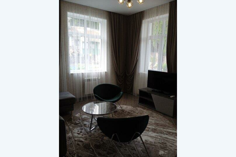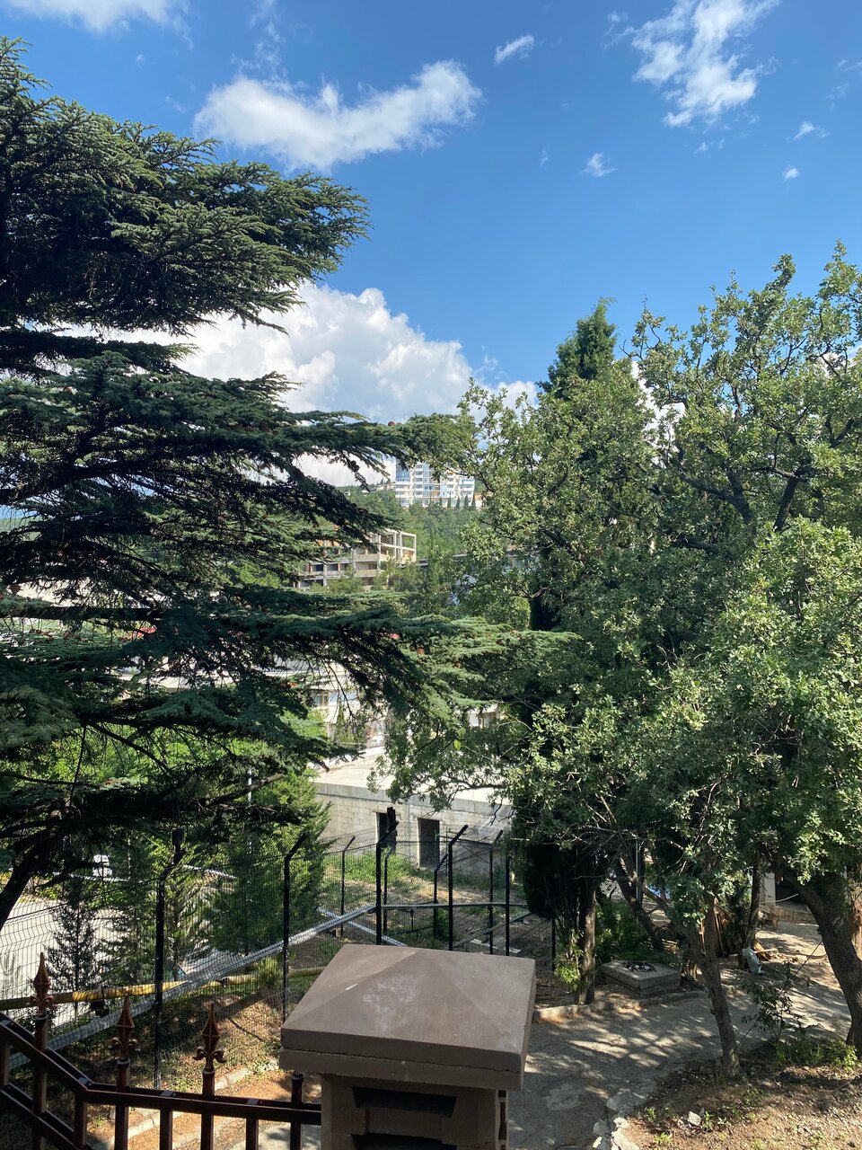 - Номер категории 'Апартаменты'. Две раздельные комнаты с кухней. Балкон. Вид с балкона на зеленные насаждения (преимущественно кипарисы). Номер находится на втором этаже. 15000₽