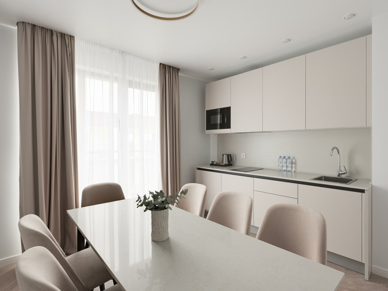 Большой функциональный номер, состоящий из двух отдельных спален и просторной кухни-гостиной с кухонной зоной и зоной отдыха.