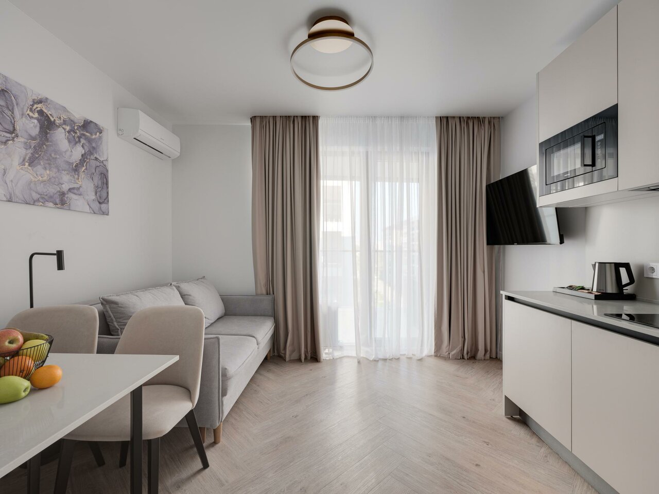 Апартаменты студия с балконом подойдут для семьи до 3 человек. Апартаменты включают в себя кухню-гостиную и полностью оборудованы всем необходимым для комфортного отдыха.