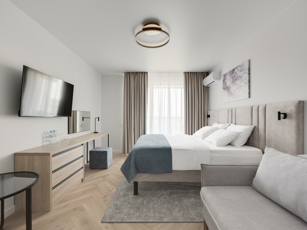 Стильный большой номер с большим балконом подойдет для семьи до 4 человек. Двухкомнатные евро-апартаменты оборудованы всем необходимым для комфортного проживания. Апартаменты включают в себя спальню и кухню-гостиную.