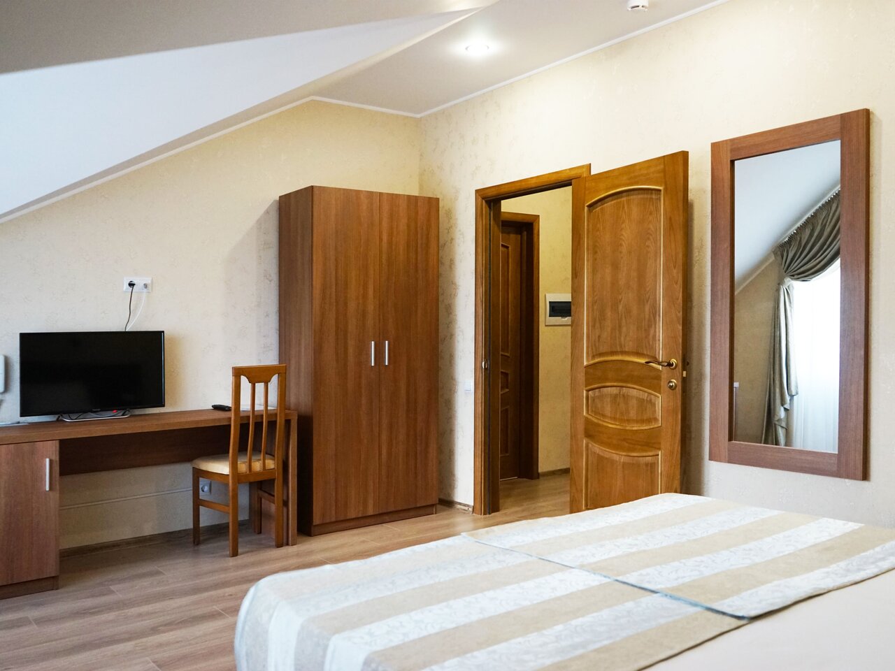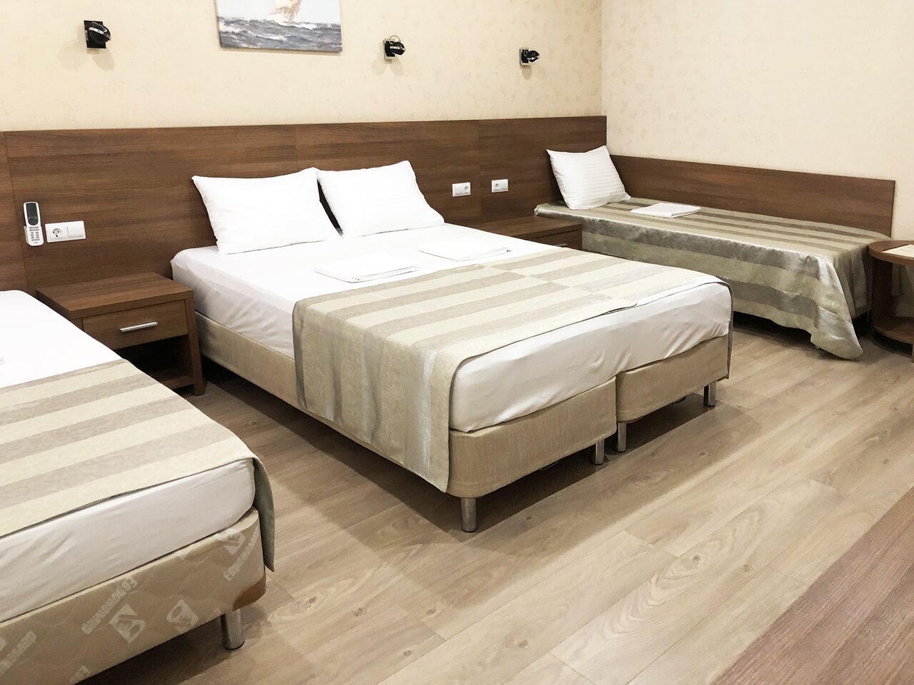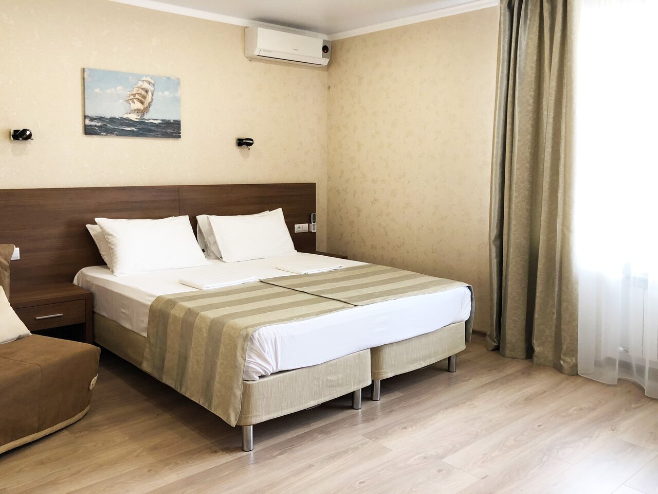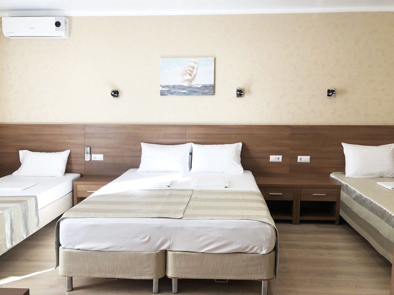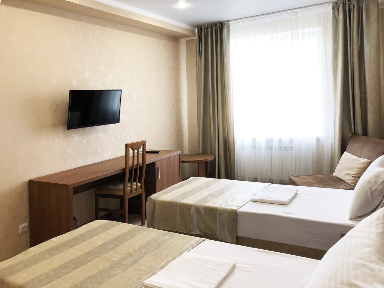 Трёхместный номер без балкона (29 кв.м.). В номере собственная ванная комната, фен, кондиционер, ЖК телевизор, мини-холодильник, сейф, полотенца, халаты, тапочки.