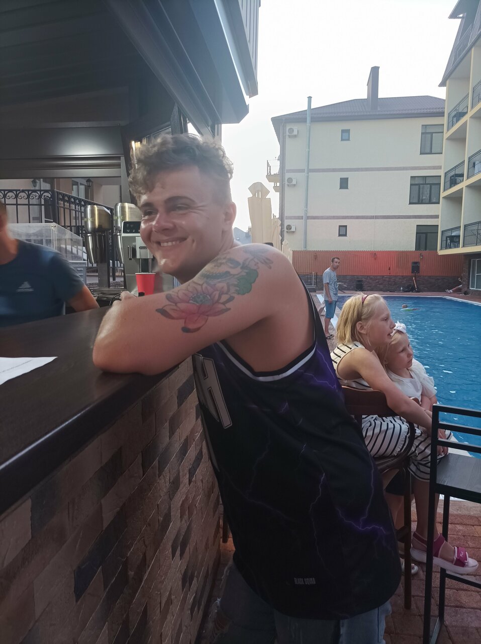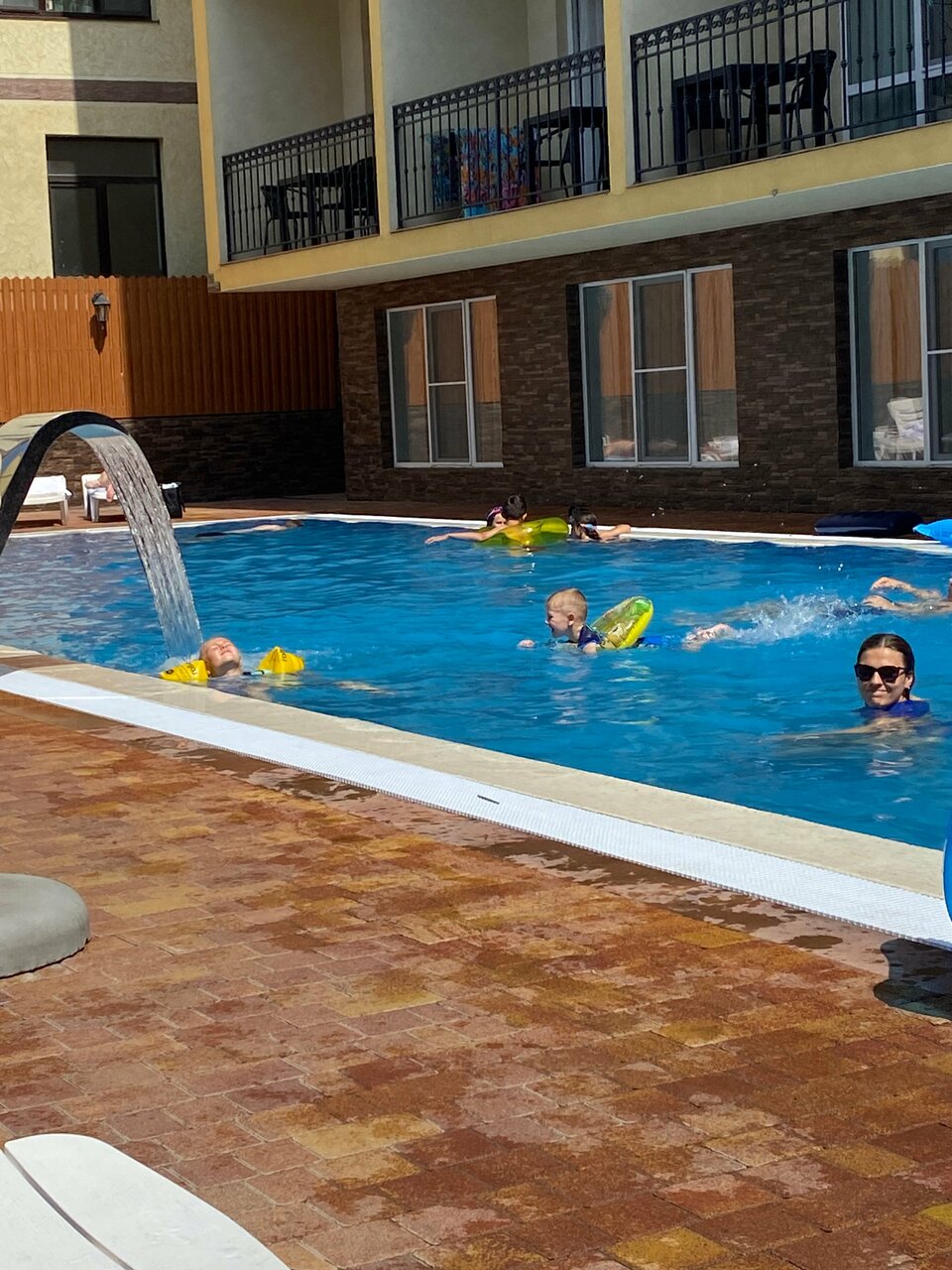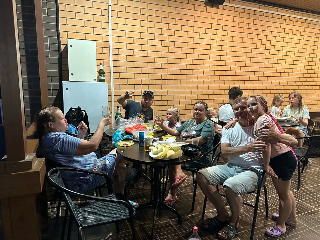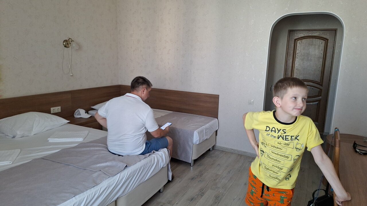 Большой отель. На территории есть тёплые бассейны, детки в восторге. У нас был номер во втором корпусе на 4 этаже, есть лифт, это большой плюс, так как были с двумя детьми, с коляской. Номер большой, чистый. Одна двуспальная кровать и две полноценно односпальных кроватки для детей. Не удобный, маленький балкон, не убирается, песок пролежал 3 дня. Есть своё кафе на территории, организация так себе, заказ в первый день ждали минут 25, напитки отдавались тем кто заказ сделал после нас, пока не подошли не сделали замечание ни чего не приносили. Еда на твёрдую 4, заказываете по меню. Оплата только переводом или наличкой. Далеко от моря, минут 20 если с детьми и коляской, дорога местами не оборудована.