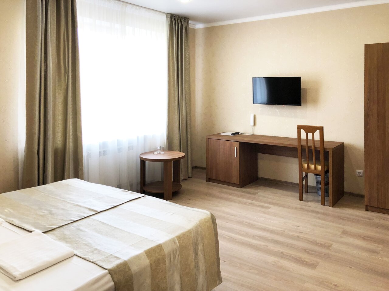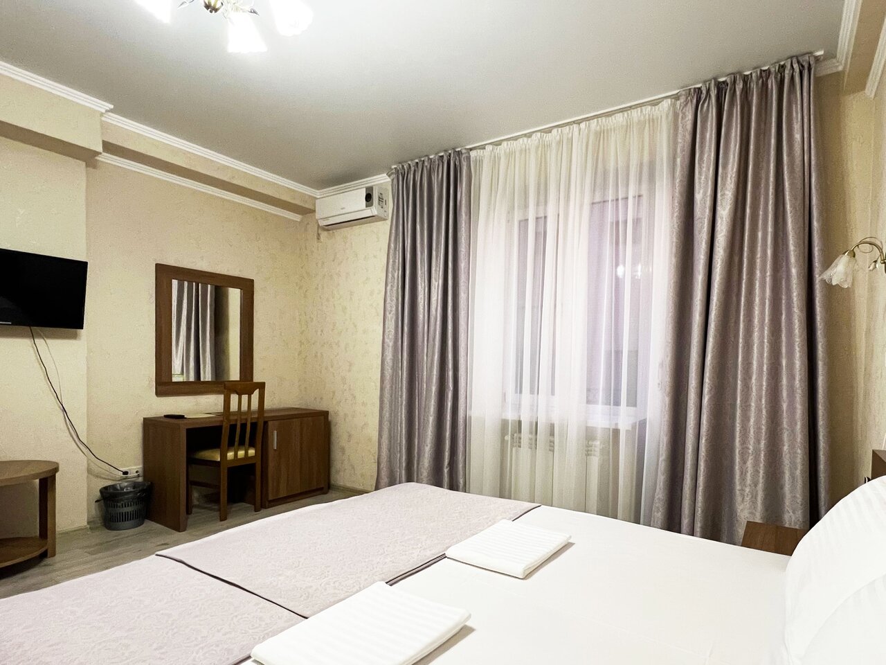 Двухместный номер без балкона (22 кв.м.). В номере собственная ванная комната, фен, кондиционер, ЖК телевизор, мини-холодильник, сейф, полотенца, халаты, тапочки.