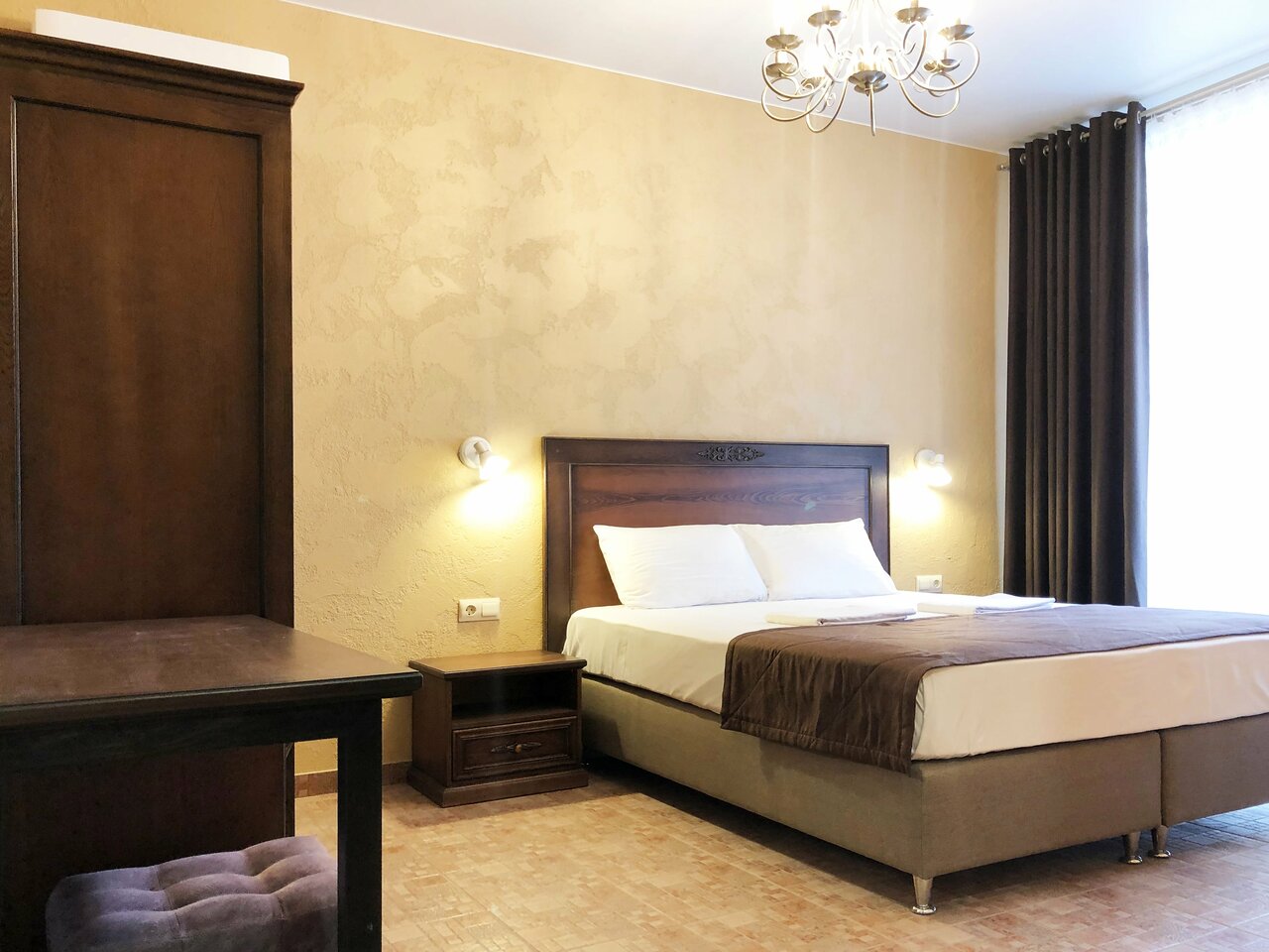 Двухместный номер с балконом (18 кв.м.), с одной двуспальной кроватью 160х200. В номере собственный санузел с душем, фен, кондиционер, ЖК телевизор, мини-холодильник, сейф, полотенца, халаты, тапочки.