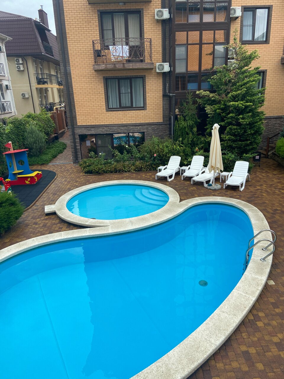 Отель оставил крайне приятные впечатления, чистые номера, регулярная смена полотенец и белья, все в рабочем состоянии. Бассейн чистый, неоднократно рано утром наблюдали за чисткой. Кафе быстро и вкусно, есть возможность пообедать — поужинать на веранде. Во всех общих помещениях установлены лампы для кварцевания (что приятно удивило) Замечательный персонал. Ухоженная территория. Наличие детской комнаты- восторг. Единственный минус- отсутствие безналичного расчёта (как практически во всех заведениях в округе).