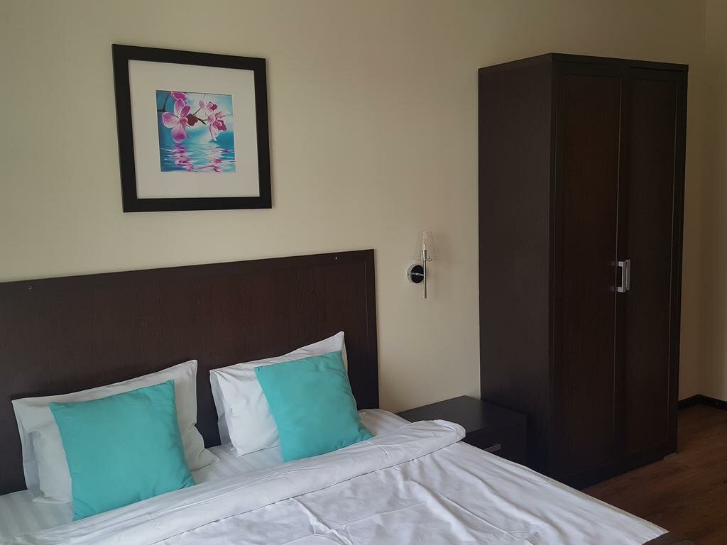 Место на (3- или 2+ из 5) кому как удобнее)) На входе приятный персонал, свежий ремонт на ресепшн. Чистая территория в общем. В номере: в ванной вентиляции нет, углы в плесени и поэтому стоит запах прелости . В комнате стены грязные, как будто там кто то катал велосипед и цеплял колесами (точно не от коляски) на потолке жёлтые пятна . В остальном все чисто (белье , тапочки, и шампунь есть. Щетки и пасты нет) Во дворе бассейн ( плавает мелкий мусор ), есть лежаки и столики со стульями. Парковочных мест не предусмотрено, придется покататься вокруг в поисках места. Завтрак хороший , шведский стол. Перед выездом вас попросят подождать пока