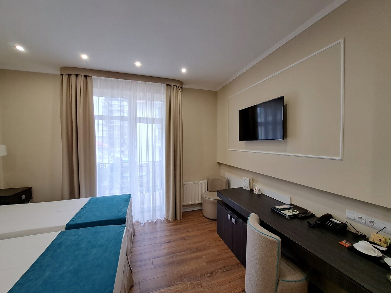Приезжали сюда с детьми, сняли номер Джуниор. Завтраки очень разнообразные,вкусные. Детям понравилось! Обслуживание на высшем уровне, персонал приятный. В номерах чисто,уютно. Имеются фен,чайный набор, чайник,телек,вай-фай. Выдают и банные полотенце и пляжные,это очень удобно!